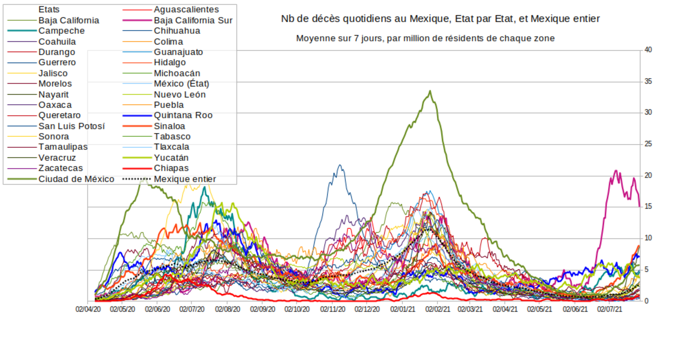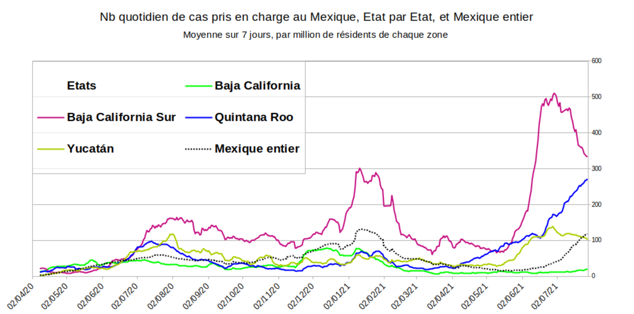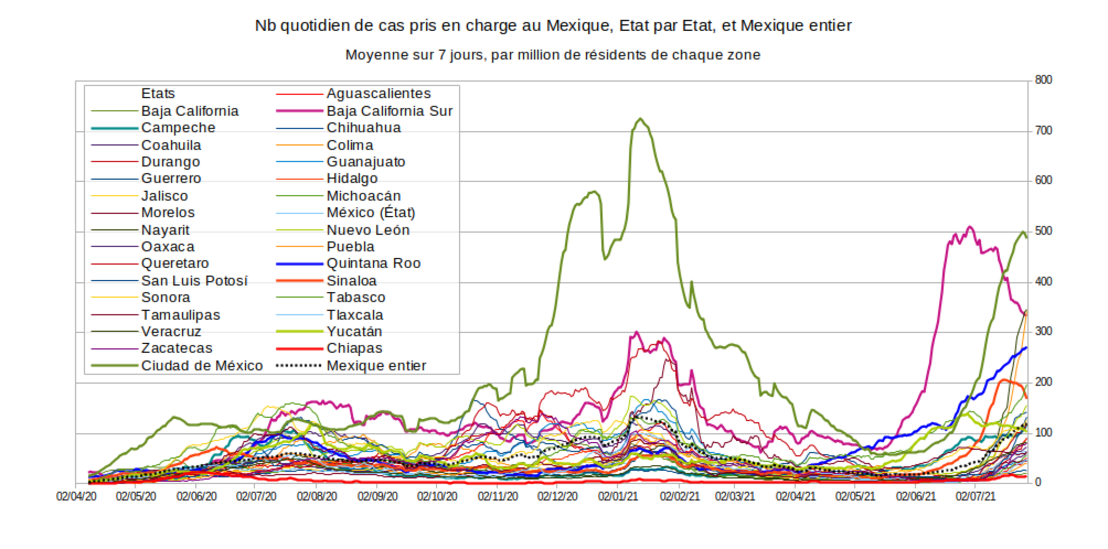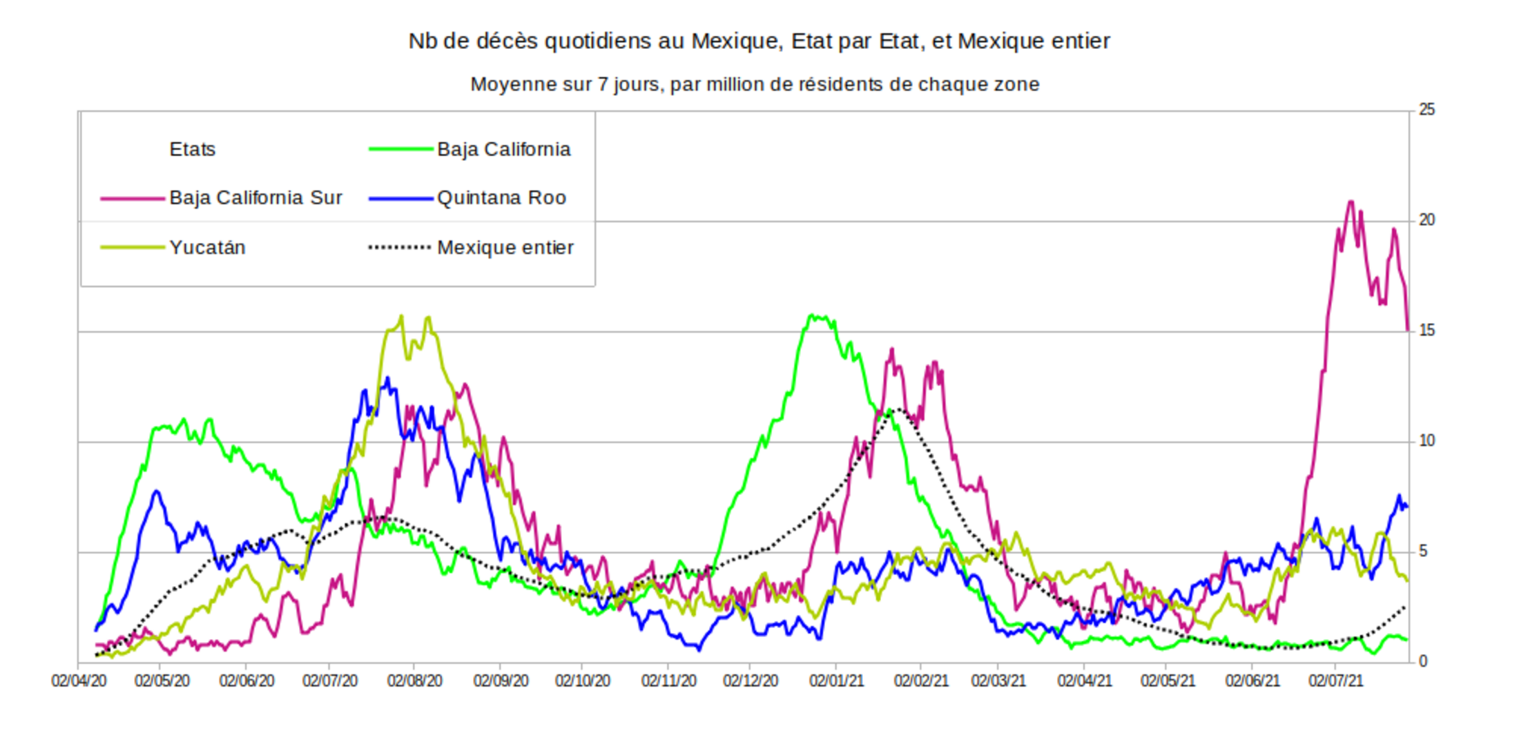 En effet, plusieurs états ont connu une reprise de l’épidémie. D’abord le Quintana Roo (à l’extrême Sud-Est du Mexique), puis ses voisins le Yucatan et le Campeche, et surtout la Basse Californie du Sud (au Nord-Ouest du Mexique), suivis de quelques états, dont notamment la Ville de Mexico.