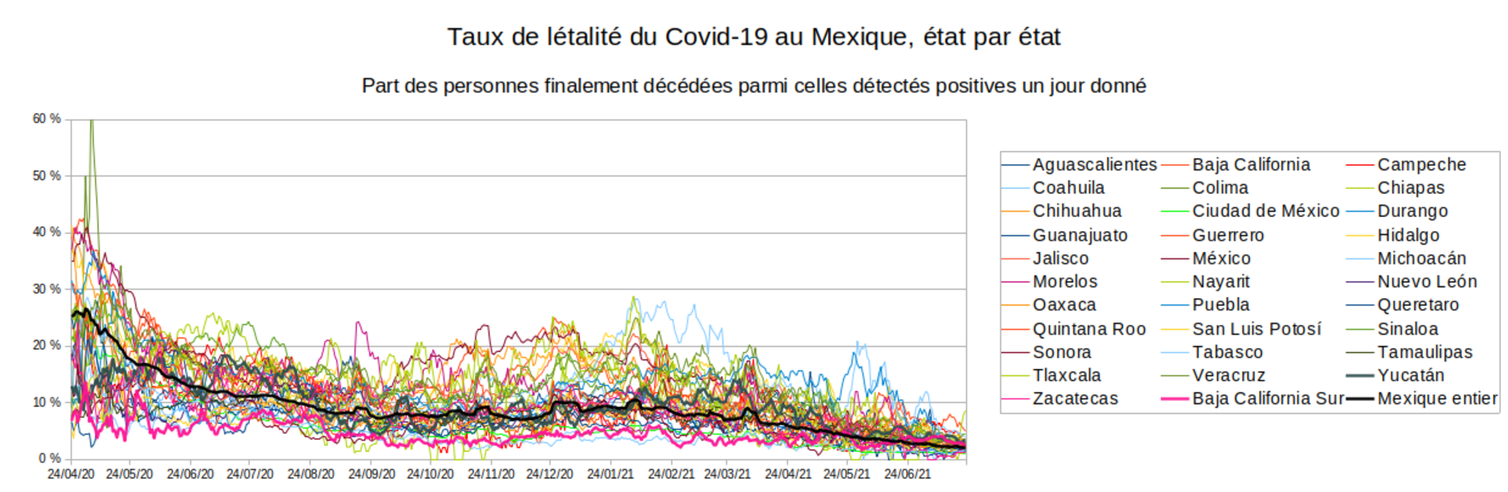 La base de données, quotidiennement mise à jour par le gouvernement central mexicain, donne, pour chaque patient diagnostiqué comme porteur du Covid-19, sa date de prise en charge (consultation, hospitalisation ou test) et l’information de son éventuel décès par la suite. Cela permet de calculer un ratio décès/contaminations — dont on peut supposer qu’il dépend en bonne partie de la façon de prendre les patients en charge — et l’évolution de ce ratio avec le temps.
