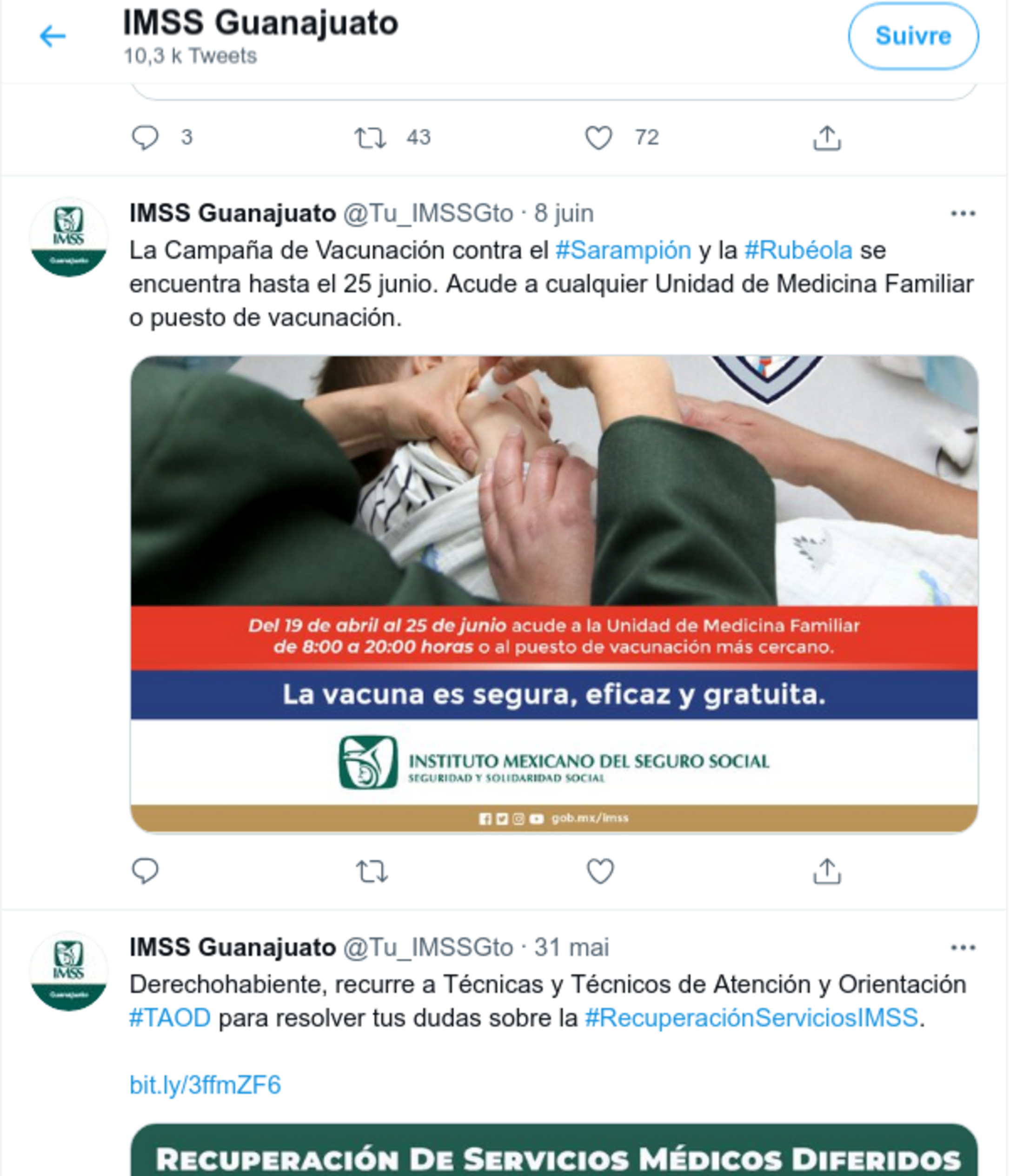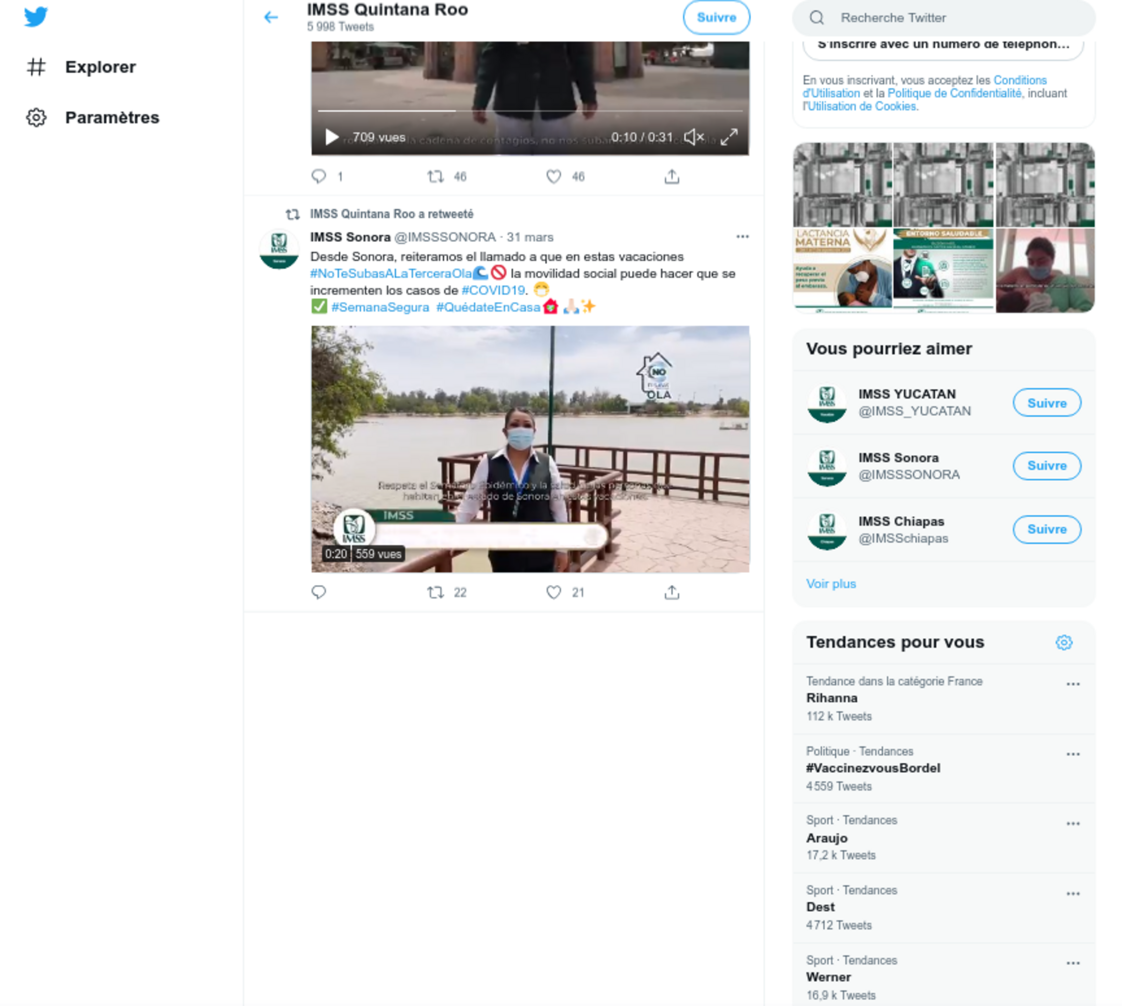 (Les comptes de l’IMSS d’autres états du Mexique ont également fait l’objet de suspensions temporaires ou définitives par Twitter, comme par exemple dans le Guanajuato (Fig.12) ou le Quintana Roo (Fig.13) Ce compte @IMSS_QRoo est récent : son premier tweet date du 31 mars 2021 (Fig.14) Il remplace vraisemblablement le compte @IMSSQRoo, définitivement suspendu pour avoir « enfreint les règles de Twitter ».)