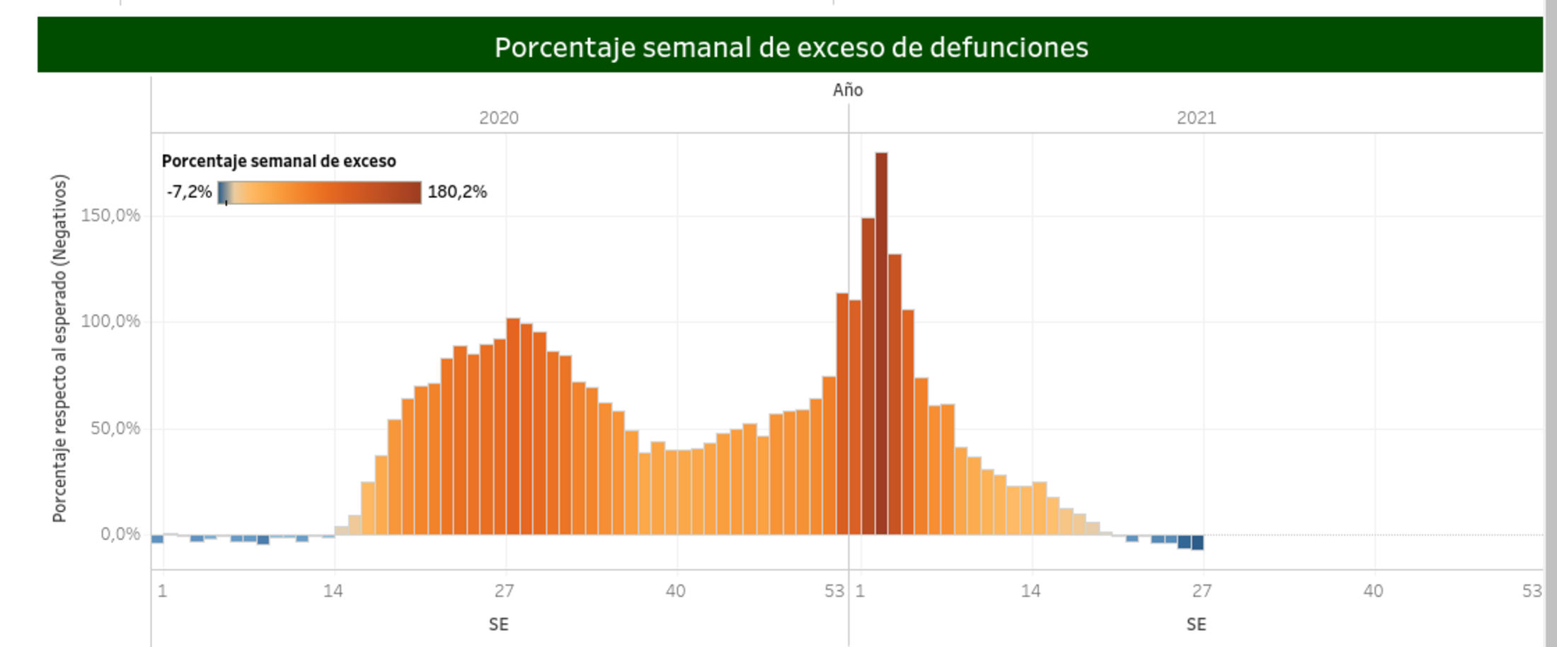 En mai dernier, on avait laissé le Mexique en pleine décroissance épidémique. Des statistiques officielles de mortalité toutes causes sont venues le confirmer : à partir de la semaine 21 (fin mai 2021) le Mexique est passé en sous-mortalité par rapport à la normale attendue (Fig.2).