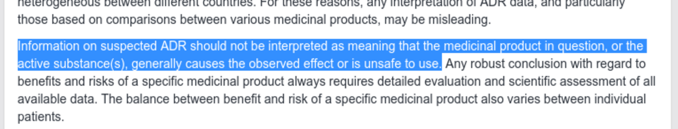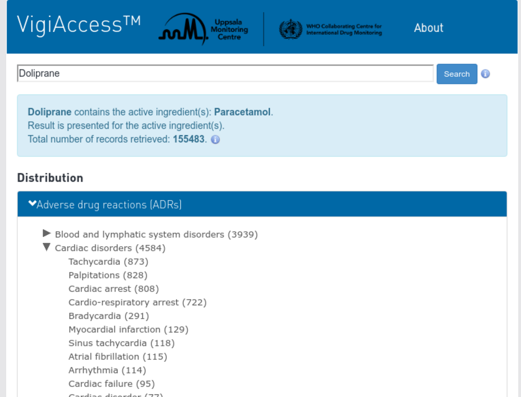 Mais reprenons notre sérieux : il est clair que toute interprétation de ces chiffres dépend du nombre d’utilisations du médicament ; or il est indéniable que les utilisations du paracétamol sont extrêmement nombreuses, et que les chiffres d'effets indésirables rapportés ici sont en réalité extrêmement faibles. Sans compter que, comme le rappelle la page d’accueil de VigiAccess, le fait qu’un effet secondaire soit suspecté ne signifie pas que le médicament provoque habituellement cet effet ou qu’il est d’un usage dangereux (Fig.3).