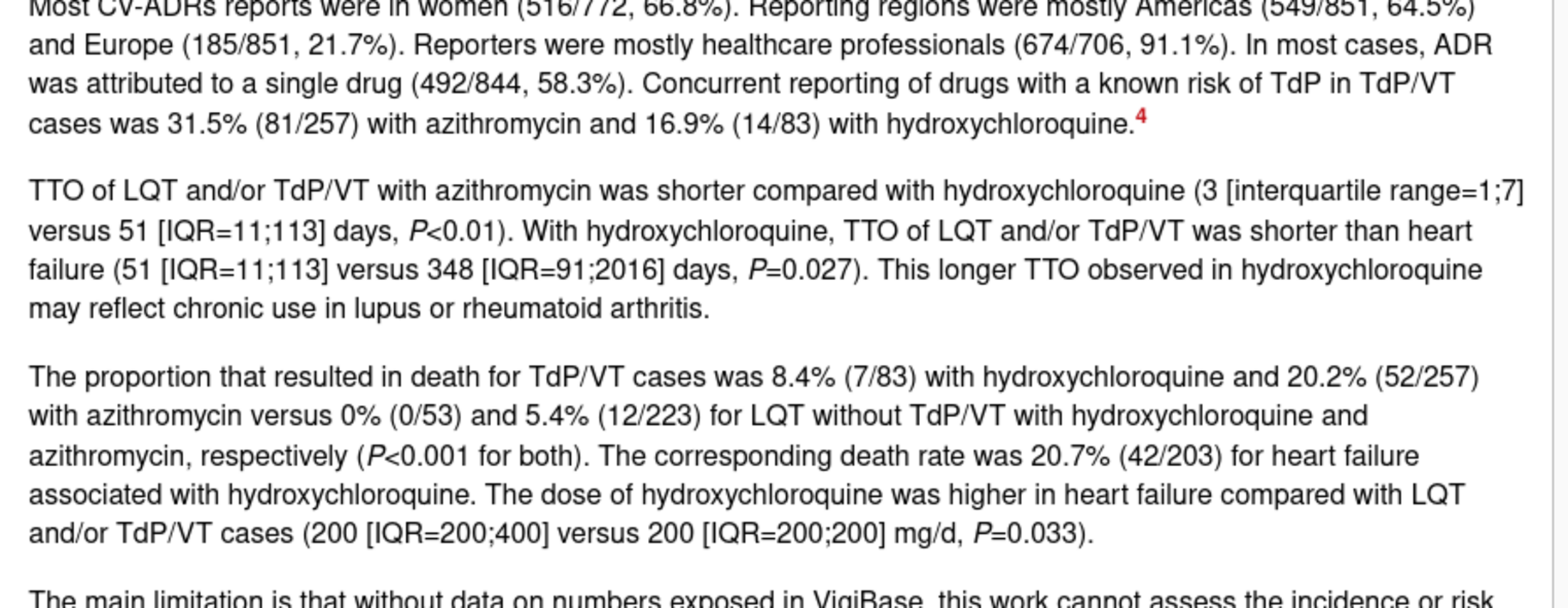 Parmi ces signalements, 53 concernaient des allongements de l’intervalle QT et 83 des torsades de pointes ou de la tachycardie ventriculaire, parmi lesquels 7 s’étaient soldés par un décès. (Ces chiffres sont tirés du dernier paragraphe reproduit dans la Fig.1)
