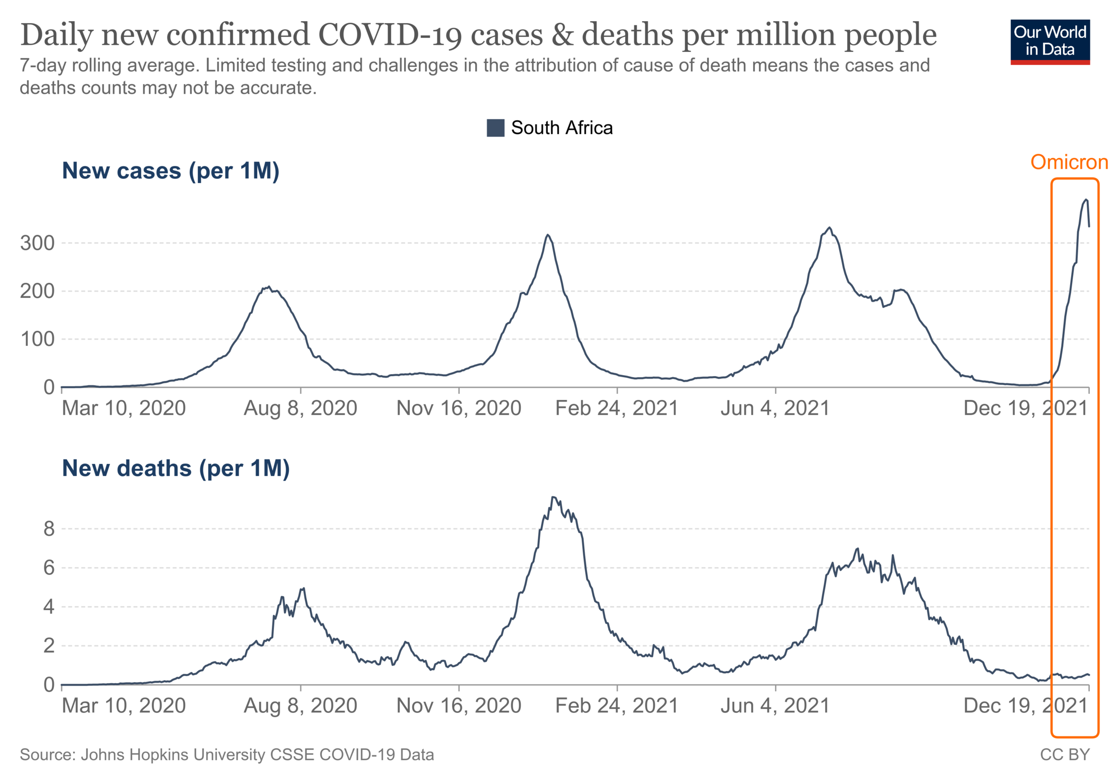 Quant à la jeunesse de l’Afrique du Sud, elle est indéniable, mais cela n’a pas empêché une certaine proportionnalité entre le nombre de cas et le nombre de décès lors des vagues précédentes. En quoi la jeunesse expliquerait que soudain la proportionnalité et la mortalité induite disparaissent pour le variant Omicron ?