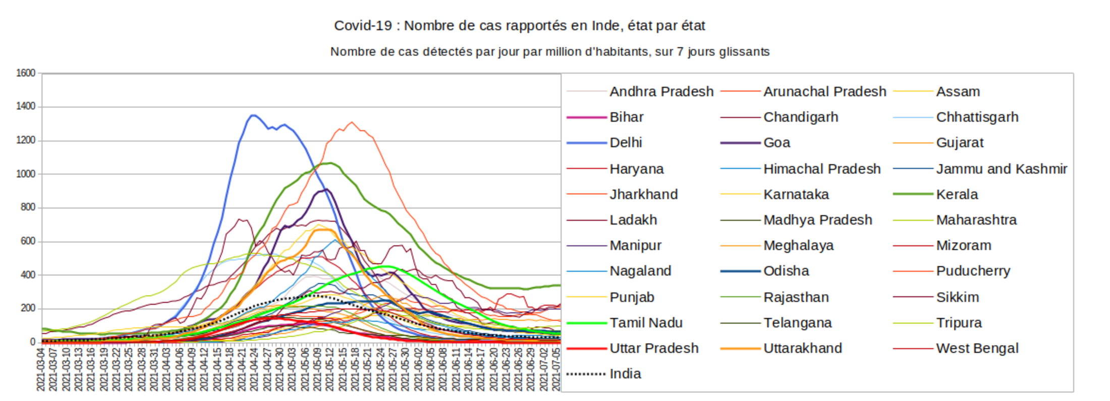 Mais sans entrer dans l’analyse impossible de ces divers facteurs, on peut tout de même remarquer que « le pic de l’Inde » ne correspond à aucune réalité : l’Inde est un sous-continent peuplé d’1,4 milliards d’habitants, composé de 36 états (ou entités), qui ont chacun leur politique sanitaire et qui ont chacun une courbe épidémique distincte*.
