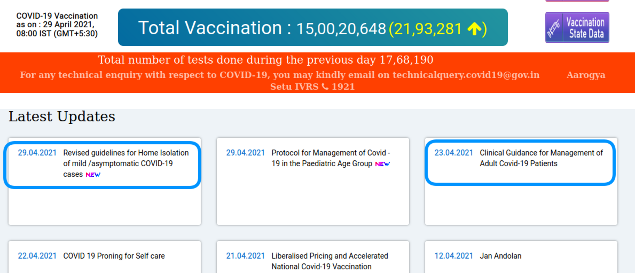 Document du 7 avril 2021 de l'AIIMSOn peut, grâce aux Archives du Web, retrouver l’apparence et le contenu du site officiel du Ministère indien de la Santé le 29 avril 2021.