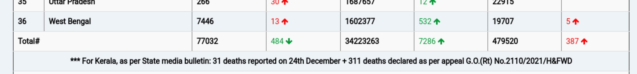 Exemple : ont peu lire au bas du tableau publié par le MoHFW que le 24 décembre 2021, le Kerala a déclaré 31 décès pour les 24 dernières heures et 311 décès plus anciens. Ainsi, le bilan officiel du Kerala pour le 23 décembre n'est pas de 342 mais de 11 décès, et celui de l'Inde n'est pas de 387 décès mais de 76 décès pour la journée du 23 décembre.