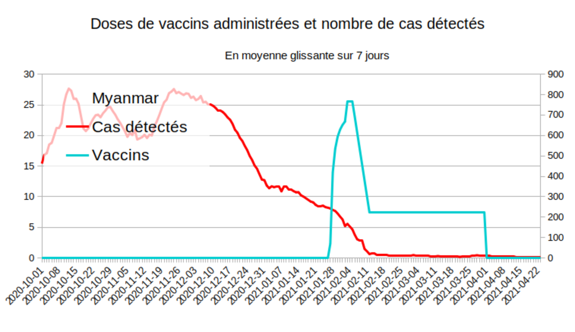 On pourrait d’ailleurs se demander si tout cela n’est pas qu’une seule et même coïncidence : peut-être que la vague épidémique de cet hiver concernait la plupart des pays d’une zones géographique à peu près en même temps, et que ce moment correspondait à la livraison des vaccins ? Quelques exemples semblent écarter cette hypothèse : en Israël, le départ épidémique s’est produit dès décembre 2020, en Jordanie en janvier, en Turquie en février et en Iran en mars.