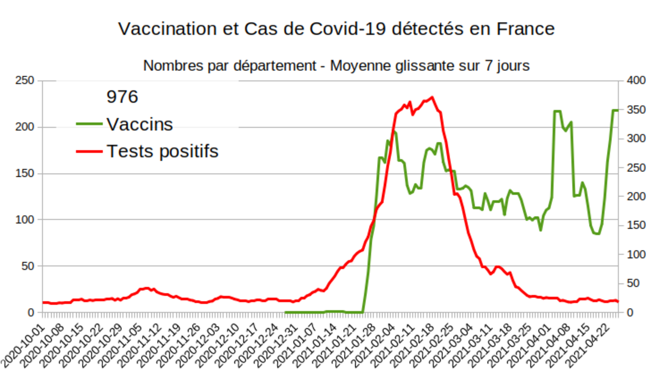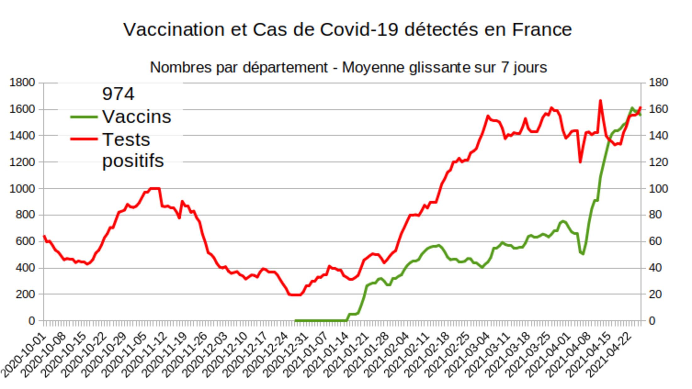 8) Puisque Santé Publique France fournit les données quotidiennes des tests, des décès hospitaliers et de la vaccination, on pourrait également se pencher sur ce qui se passe en France, département par département. Si l’on regarde les départements insulaires, moins exposés aux déplacements que les départements continentaux, le constat est quasi-systématique : Guadeloupe, Martinique, Corse et la Réunion (Fig.9 à 13) ont vu une remontée épidémique synchrone avec la vaccination. Une exception « ambiguë » : Mayotte (Fig.14), où l’épidémie était déjà en hausse lorsque la vaccination a commencé. La Guyane (Fig.15), elle aussi coupée des territoires voisins par des frontières, a connu une vaccination et une épidémie quasi-synchrones.