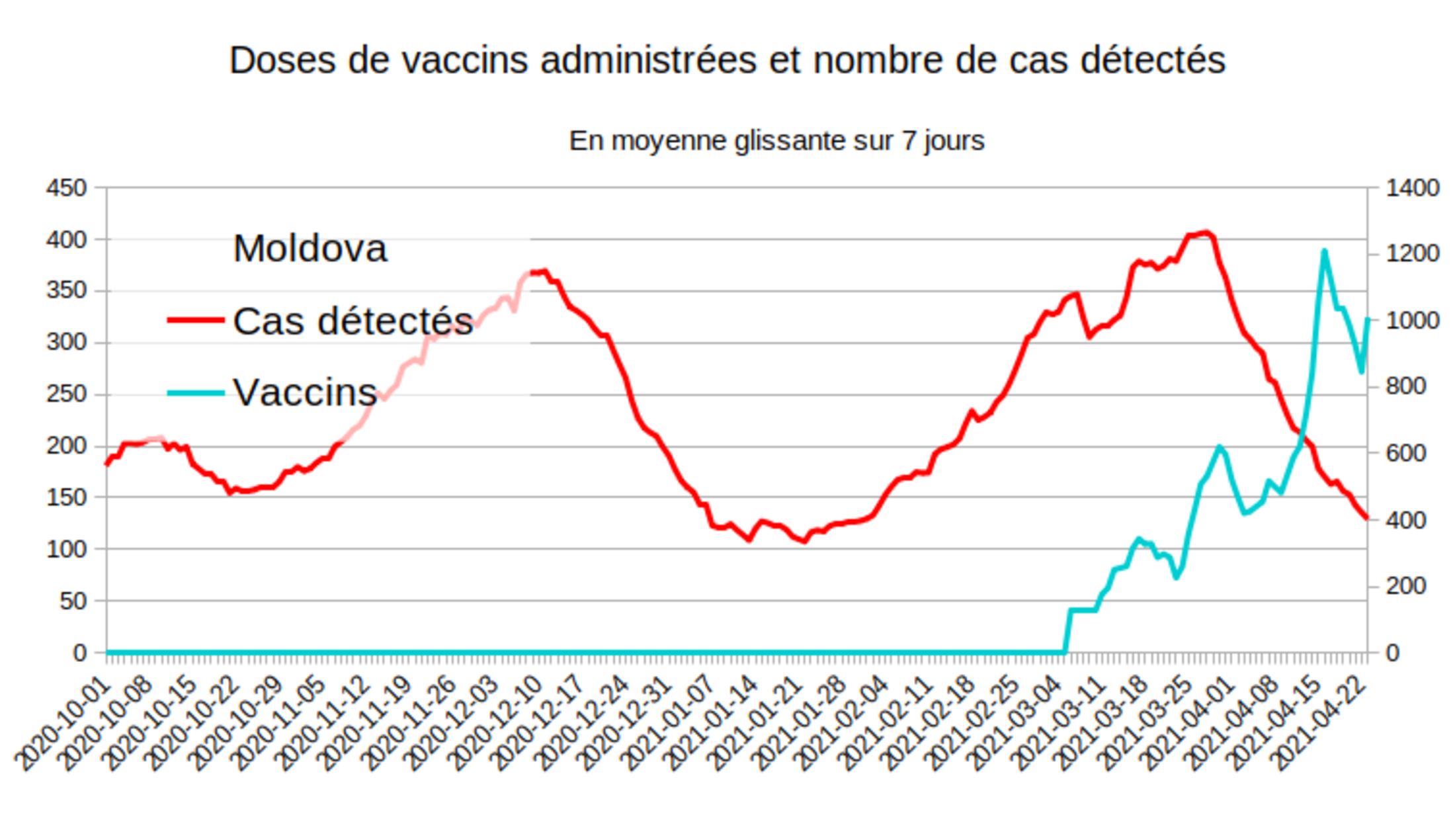- Quoi qu’il en soit, il faudrait se pencher sur les contre exemples apparemment solides, comme la Moldavie (Fig.8), où la vague épidémique a précédé de 2 mois la vaccination, et où la redescente de la vague n’a pas été ralentie par la campagne de vaccination.