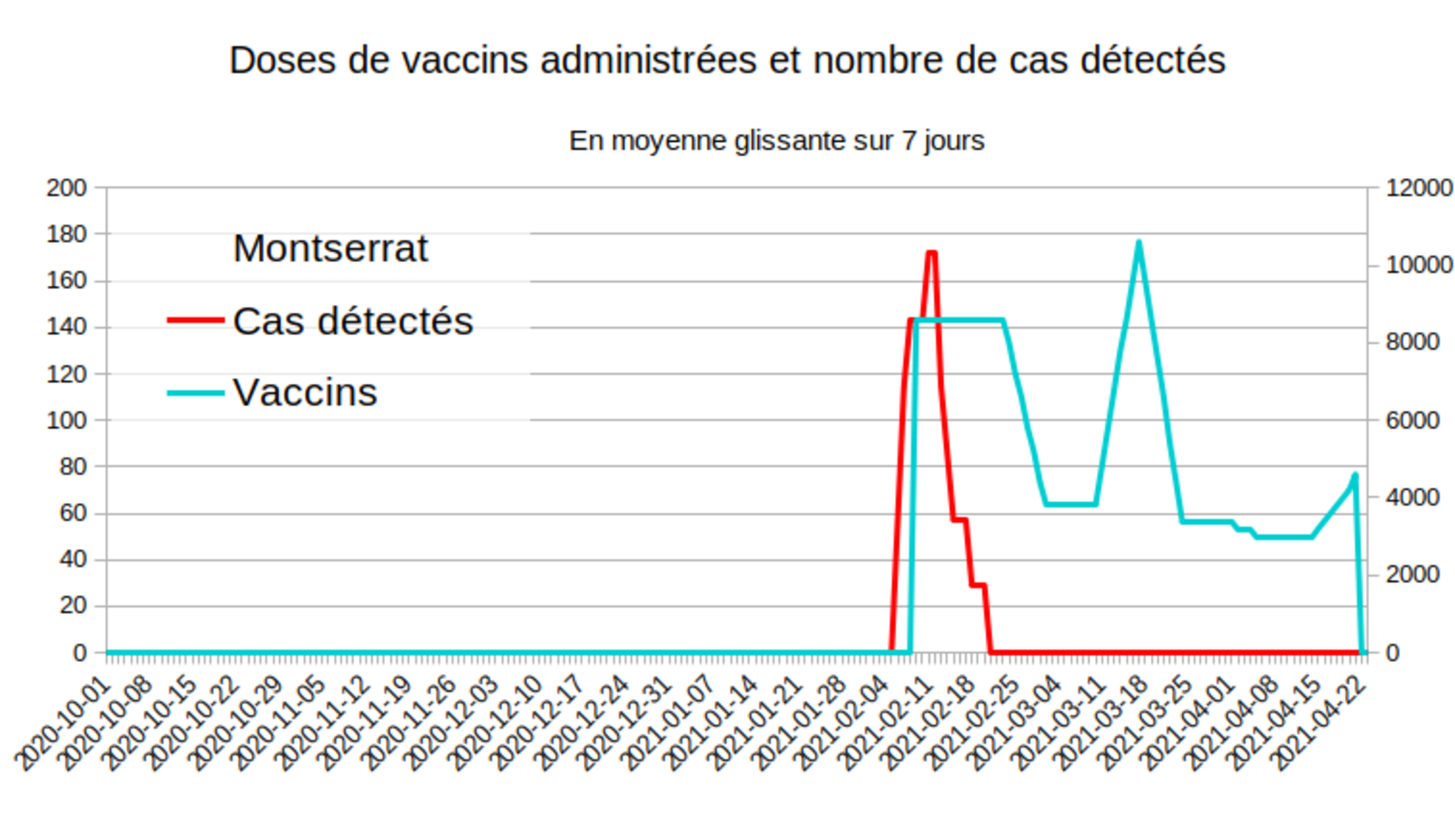 3) Dans certains cas, il est manifeste que les données ne sont pas exactes, mais qu’elles ont été « estimées » ou reconstituées. Ainsi pour la Birmanie, le « plateau » observé sur la courbe de vaccination (Fig.6) signifierait en théorie que 12222 doses exactement ont été administré chaque jour du 12 février au 31 mars. De même, à Montserrat (Fig.7), ce serait 43 doses quotidiennes qui auraient été administrées chaque jour pendant 10 jours. Ce genre de chiffres laisse deviner que, des données manquant pour plusieurs jours, on a « lissé » les quelques chiffres qu’on avait en répartissant artificiellement les chiffres sur plusieurs dates.
