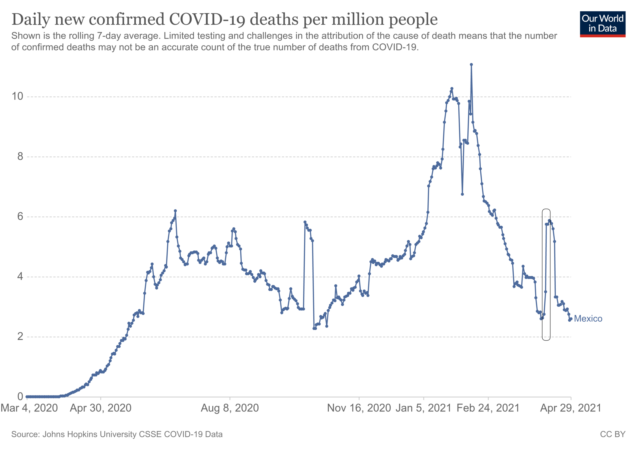 Cette courbe tirées des fichiers officiels mexicains est moins éloignée de la réalité, mais elle ne la reflète pas encore exactement, loin s'en faut : d’un côté, des décès ont pu être attribués à tort au Covid-19, de l’autre, des décès dus au Covid-19 sont absents de ces statistiques, et il est a priori impossible de reconstituer les « vrais » chiffres, ceux qui refléteraient exactement l’impact du Covid-19 sur la mortalité des mexicains.