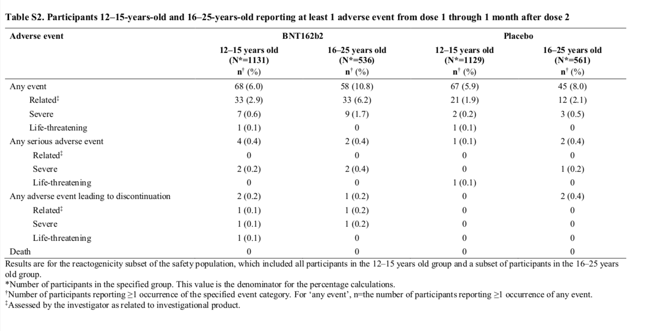 L’article de Frenck et al. détaille dans sa Figure 2 le nombre de réactions normalement attendues (douleur dans la zone d’injection, fièvre, courbatures, fatigue etc.) pour chacun des deux groupes (en les comparant aussi avec les groupes de patients de 16 à 25 ans inclus dans une autre étude, mais on ne s’attardera pas sur ce point.) Il constate que le groupe vacciné montre davantage d’effets de ce type, ce qui n’est pas surprenant. Un cas est brièvement mentionné dans le paragraphe Reactogenicity, avant d’être développé plus bas, en tant qu’événement indésirable : le lendemain de la 1ère dose, un jeune vacciné a connu un épisode de fièvre dépassant 40°.