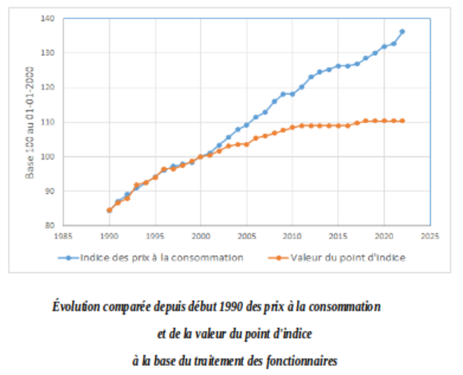 Avant 2000, le point d’indice à la base du traitement des fonctionnaires était indexé sur l’inflation. Depuis 2000, il a augmenté de seulement 10,4% alors que l'inflation a été de 36.2%. Ainsi, le pouvoir d’achat moyen des fonctionnaires en 2022 est d’environ 20 % inférieur à ce qu’il était en 2000. Si le gel du point d’indice se poursuit jusqu’en 2027, la perte supplémentaire sera de 10 à 20%.