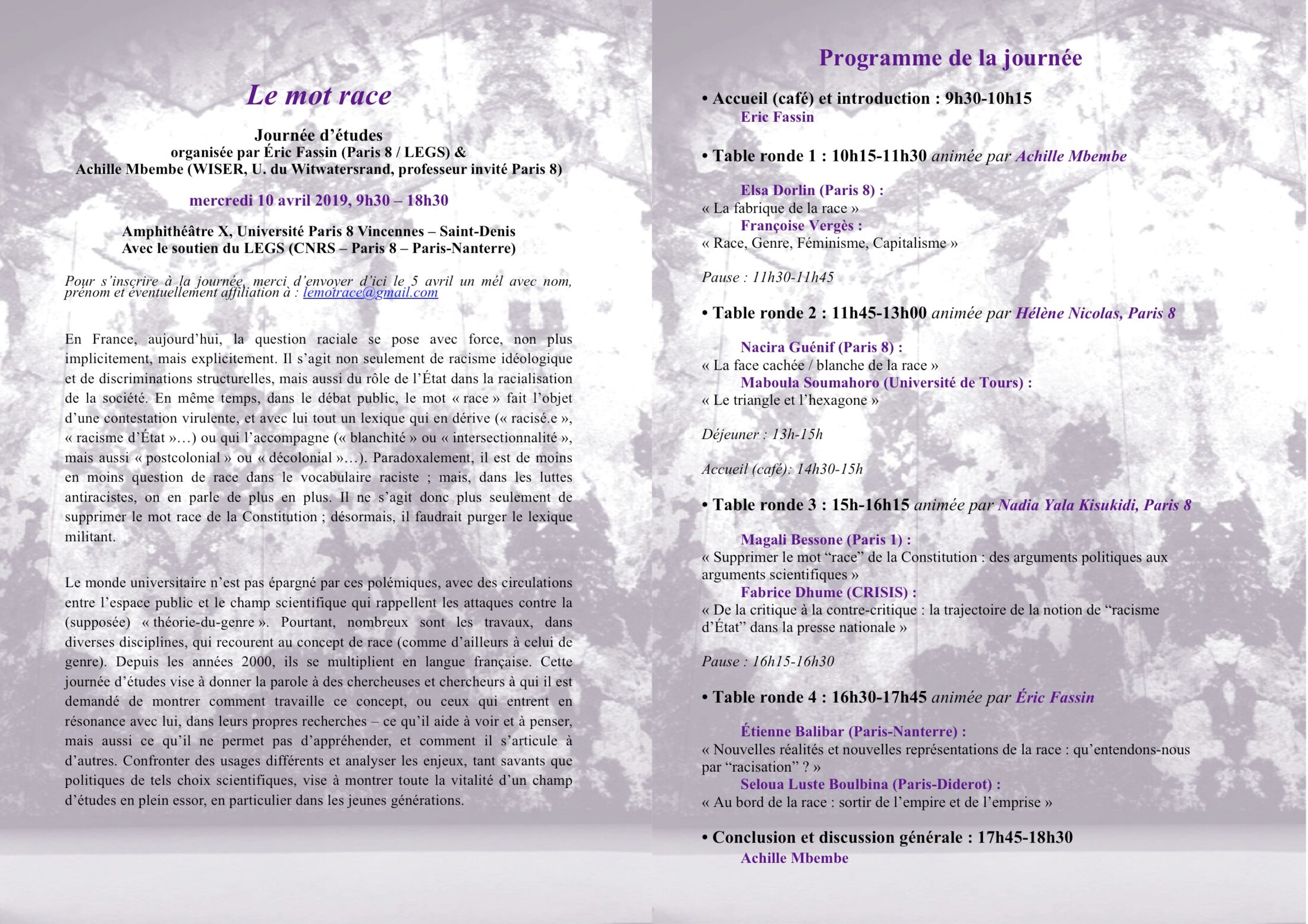 Journée d'étude : "Le mot race" 10 avril 2019 (programme)
