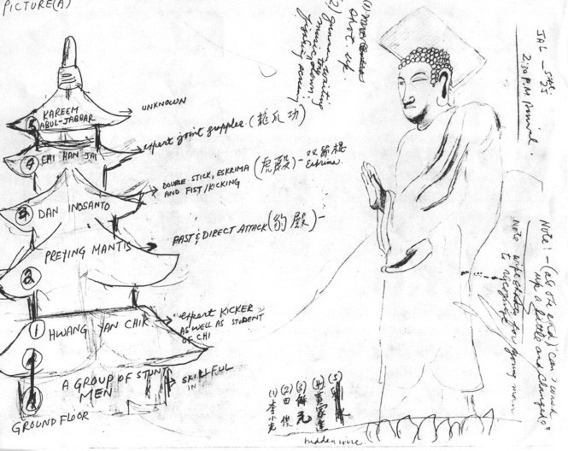 Au premier étage de la Pagode, Bruce Lee affronte Hwang In-shik, un maître Coréen expert en coups de pied, une technique unique qui donne l'occasion à Bruce Lee de montrer la supériorité du Jeet Kune Do. Au deuxième étage, le maître Taky Kimura mêle un Kung-Fu de style mante religieuse à quelques figures de Wing Chun, deux styles de combat en corps à corps avec l’usage prépondérant des mains. Au troisième niveau, Lee apparaît vêtu de sa mythique combinaison jaune à bande noire qui démontre qu’il n’appartient à aucun art martial défini. Son adversaire le maître Dan Inosanto, lui, porte un kimono traditionnel et associe Karaté Kempo et Kali Eskrima philippin. C’est aussi un virtuose du nunchaku. Le combat monte ainsi en puissance avec trois disciplines et l'apparition des armes. Au quatrième étage, Lee affronte Ji Han-Jae, un grand maître de Hapkido Coréen (Voie des énergies unifiées) qui se trouve être, lui-même, un art composé de différentes techniques : percussions, immobilisations, projections. Après un combat acharné, plus difficile que les précédents, Bruce Lee finit par lui briser le dos.