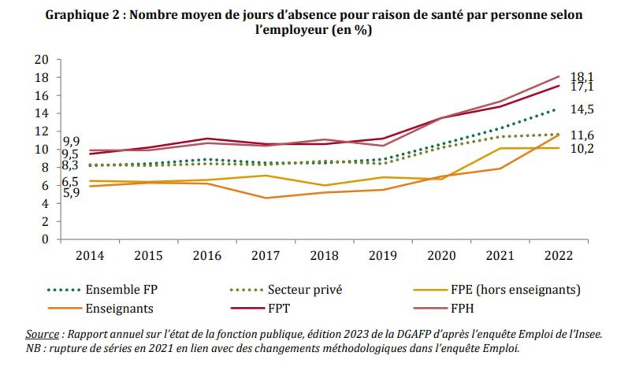 Réponse : déjà, même si les couleurs et le style en général sont différents, il s’agit dans les deux cas de lignes brisées qui représentent exactement les mêmes valeurs : celles des durées d'absences de 2014 à 2022, à partir des « enquêtes emploi » de l’INSEE, et utilisées d’abord par la DGAFP en 2023.