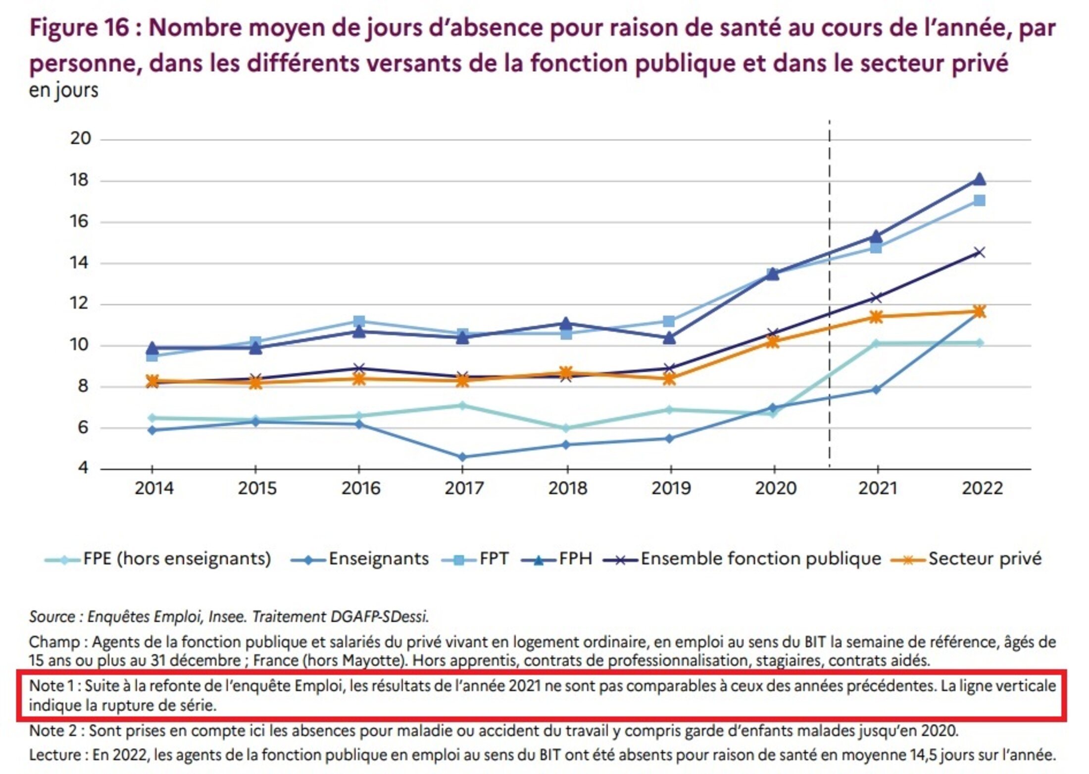 D’abord, les « enquêtes emploi » de l’INSEE ont subi une réforme, appliquée en 2021, concernant par exemple la façon dont sont ou non comptabilisés certains types d’arrêts pour raison de santé. Dans la partie « Temps et organisation du temps de travail » de son « Rapport annuel sur l'état de la fonction publique » (Édition 2023), la DGAFP a bien fait mention des précautions à prendre quant à l’utilisation des données ante et post 2021, estimant d’ailleurs et surtout explicitement que cette réforme avait tendance à rendre les durées d’absences plus importantes qu’avant 2021. Même si dans le rapport cette réforme est mentionnée, il n’y a aucune allusion à un éventuel effet sur des comparaisons de données ante et post réforme, alors que les auteurs avaient évidemment connaissance du rapport de la DGAFP sur lequel ils se sont d’ailleurs parfois appuyés. A moins de considérer que les précautions prises par la DGAFP n’étaient pas justifiées ? Un éclaircissement s’imposerait … D’autant plus que le ministre G. Kasbarian a basé une partie de bonne partie de son argumentaire sur ce genre de comparaisons chronologiques …