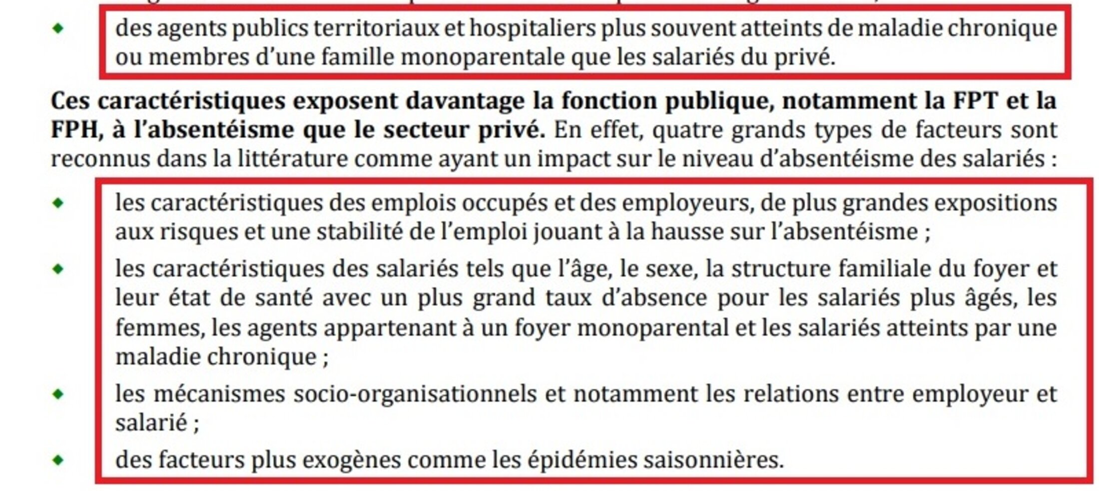 « Le coût de l’écart de taux d’absence pour raison de santé entre fonction publique et secteur privé, une fois contrôlé des effets structure, est de l’ordre de 16 k ETP soit un impact financier de journées rémunérées non travaillées de 0,7 Md€ et ne concerne quasi exclusivement que la FPT. »