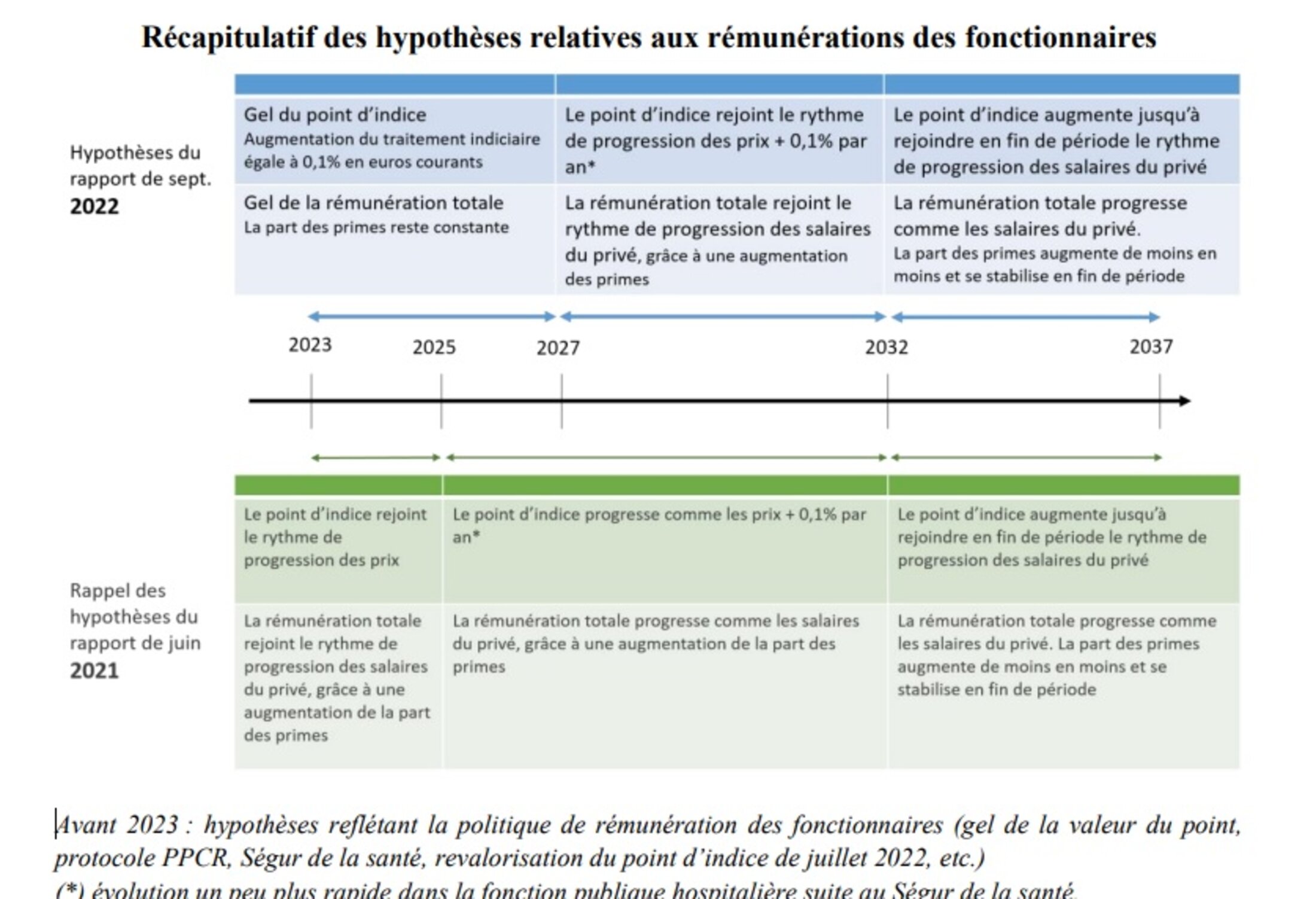 L’illustration 11 montre les différences sur les hypothèses de revalorisation des fonctionnaires entre 2021 ( et même 2017) et 2022.