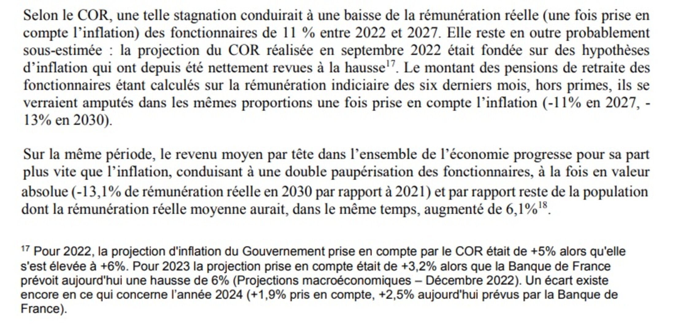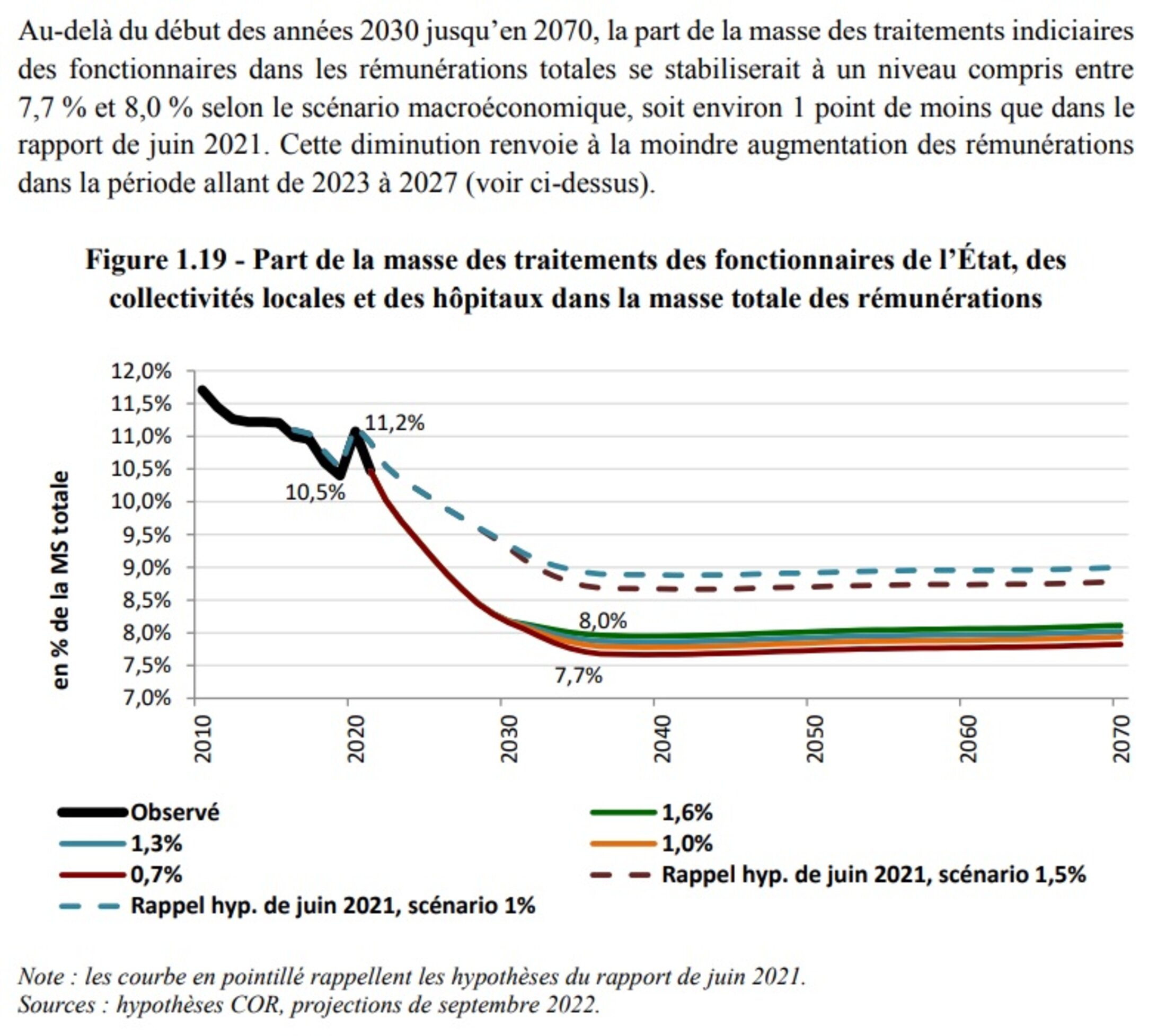 Et les conséquences sont chiffrées : environ un tiers des déficits prévus pour le système de retraite serait dû uniquement à cette stagnation d’effectifs + paupérisation des fonctionnaires ces prochaines années !