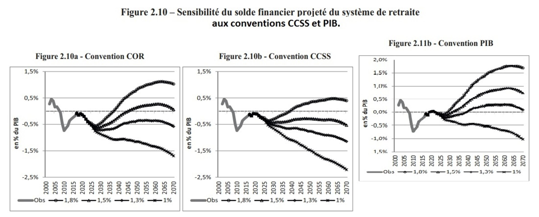 En convention PIB on a des soldes positifs à long terme (sauf pour le scénario à 1 % de croissance), et tous supérieurs à ce qui est observé en convention COR, avec comme raison principale les mêmes gains en dépenses de pensions pour les fonctionnaires, de par la baisse continue de leur masse. Cela signifie que si la participation de l’Etat aux caisses de retraite était fixée en pourcentage du PIB constant, alors il n’y aurait a priori pas de difficultés à long terme.