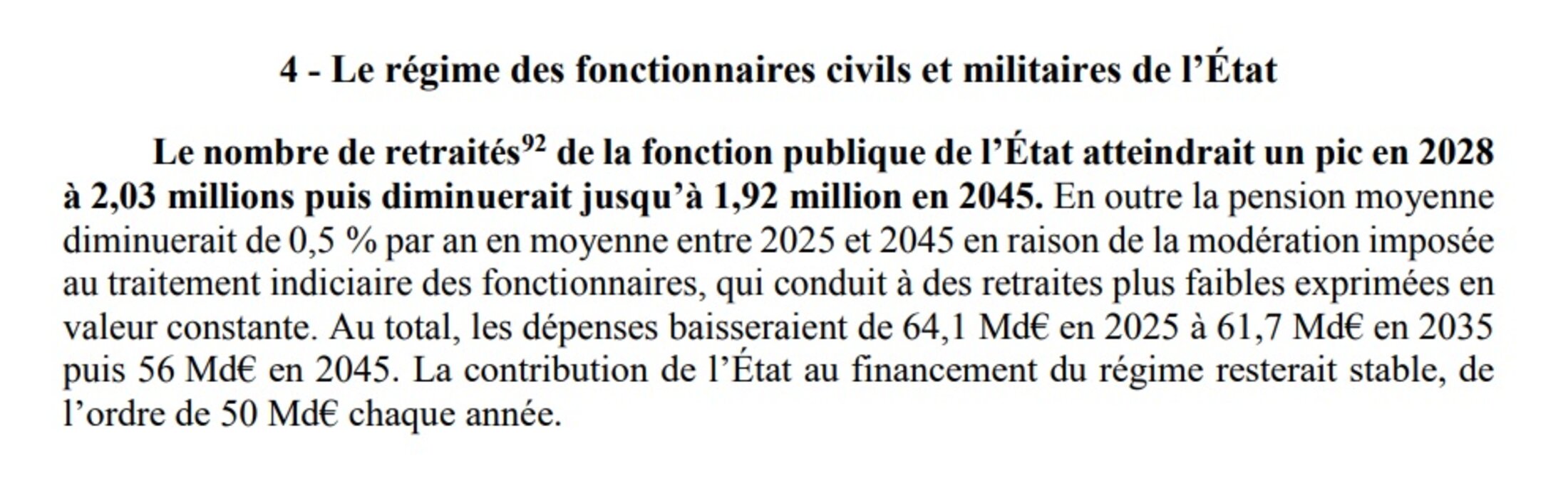 « une sous-indexation d’un point des pensions par rapport à l’inflation permettrait une économie de 2,9 Md€ pour cette même année, y compris pour les régimes équilibrés par l’État. »