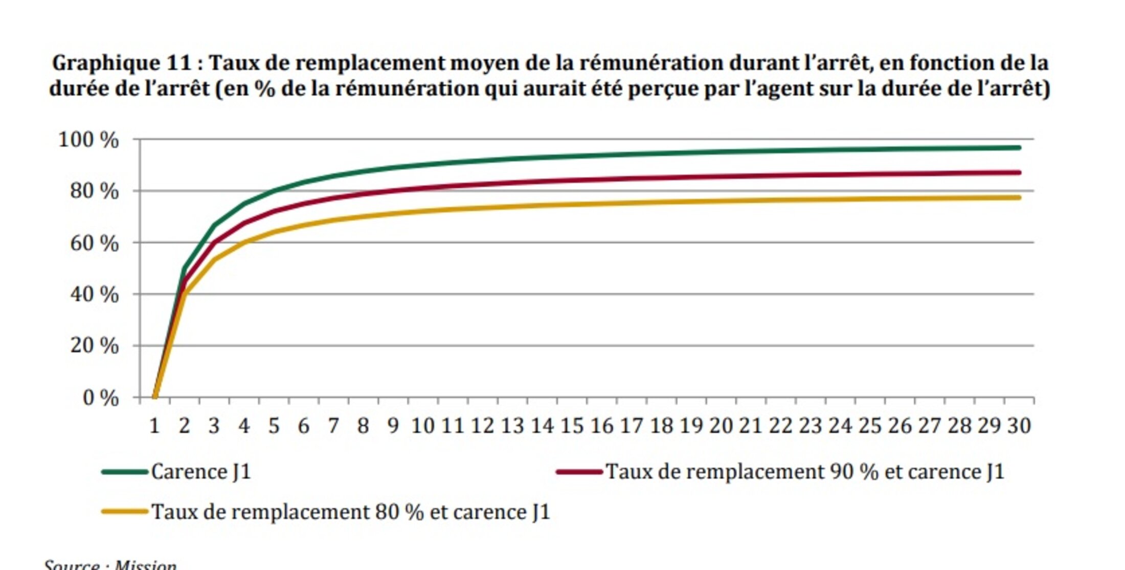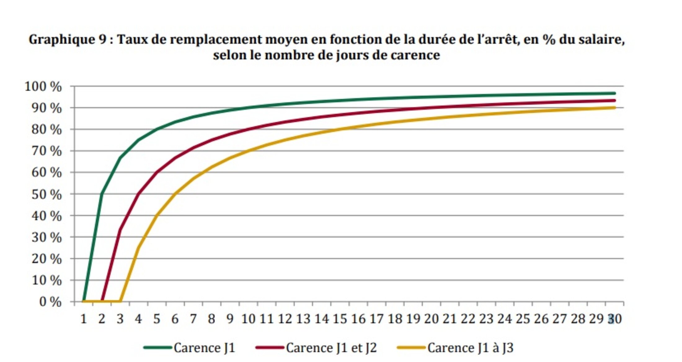 « Le passage d’un jour de carence à deux ou à trois jours de carence dégraderait le taux de remplacement effectif pour l’agent public en arrêt maladie (cf. graphique 9). En effet, pour un arrêt maladie de cinq jours, le taux de remplacement de la rémunération de l’agent sur la durée de l’arrêt s’élèverait à 60 % avec deux jours de carence et à 40 % avec trois jours de carence contre 80 % avec un seul jour de carence. Pour un arrêt maladie de dix jours, les taux de remplacement s’élèveraient à respectivement 80 %, 70 % et 90 %. »