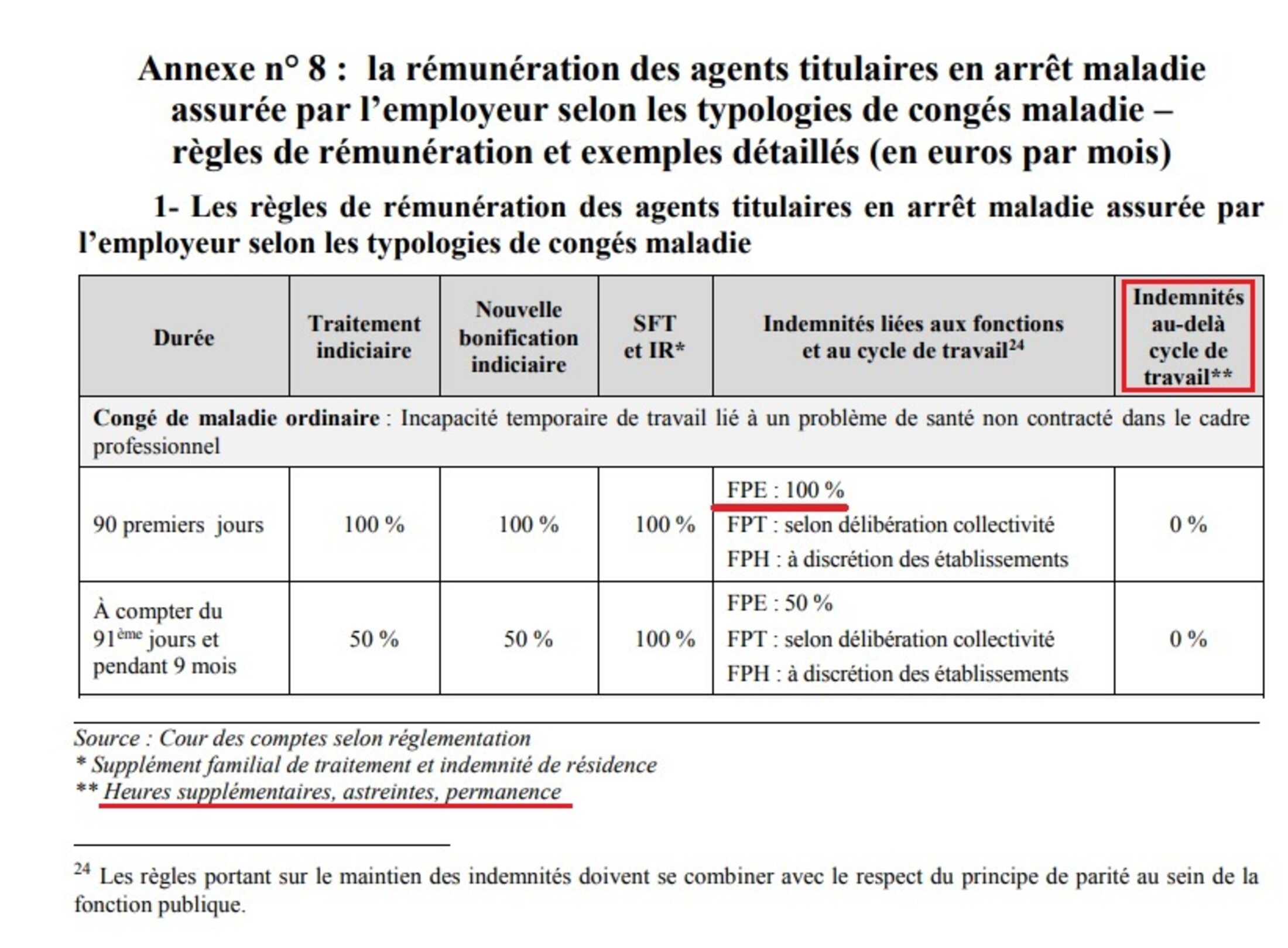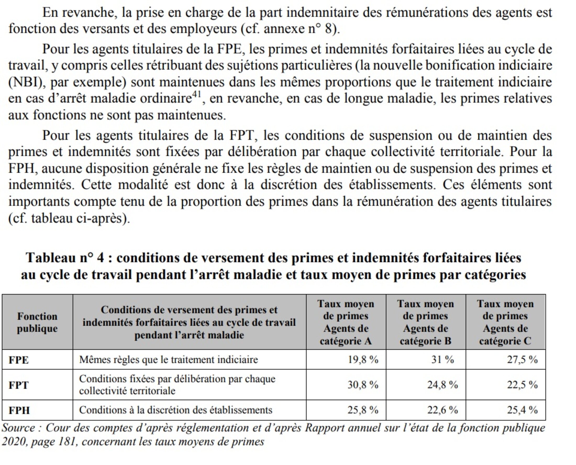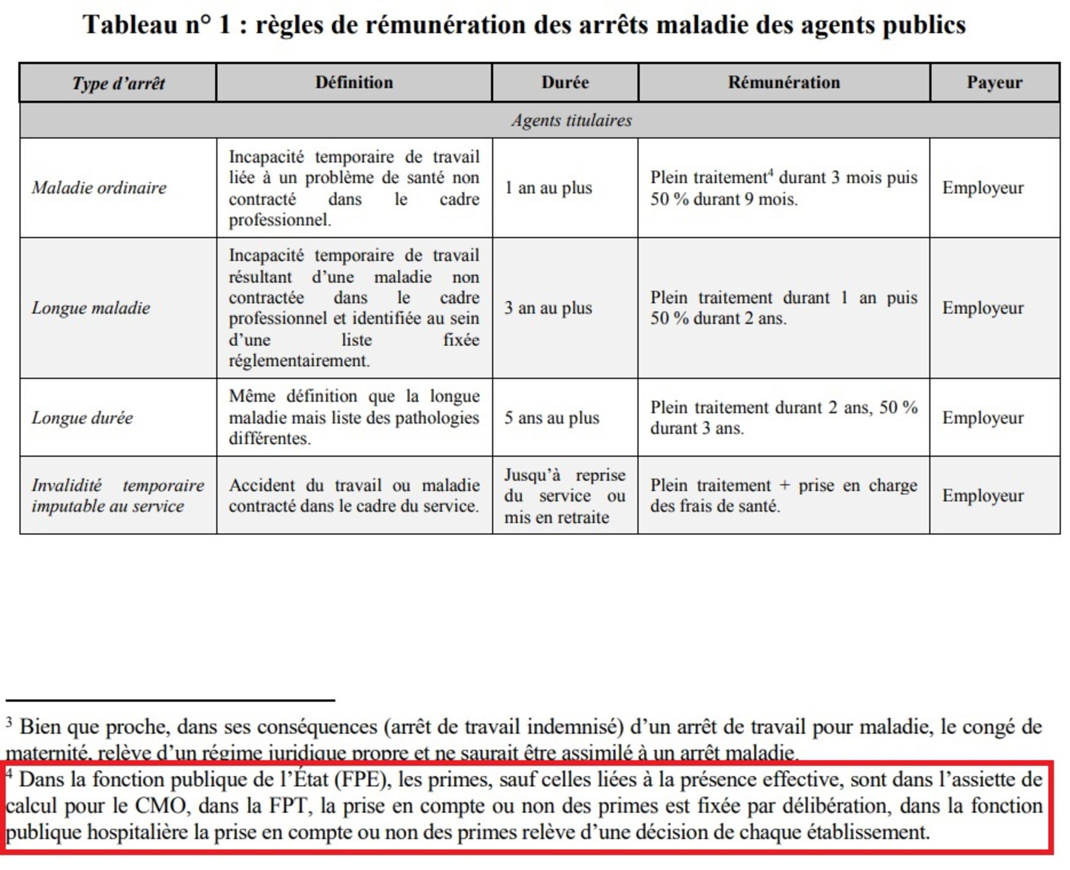 « Dans la fonction publique de l’État (FPE), les primes, sauf celles liées à la présence effective, sont dans l’assiette de calcul pour le CMO (congé maladie ordinaire), dans la FPT, la prise en compte ou non des primes est fixée par délibération, dans la fonction publique hospitalière la prise en compte ou non des primes relève d’une décision de chaque établissement ».