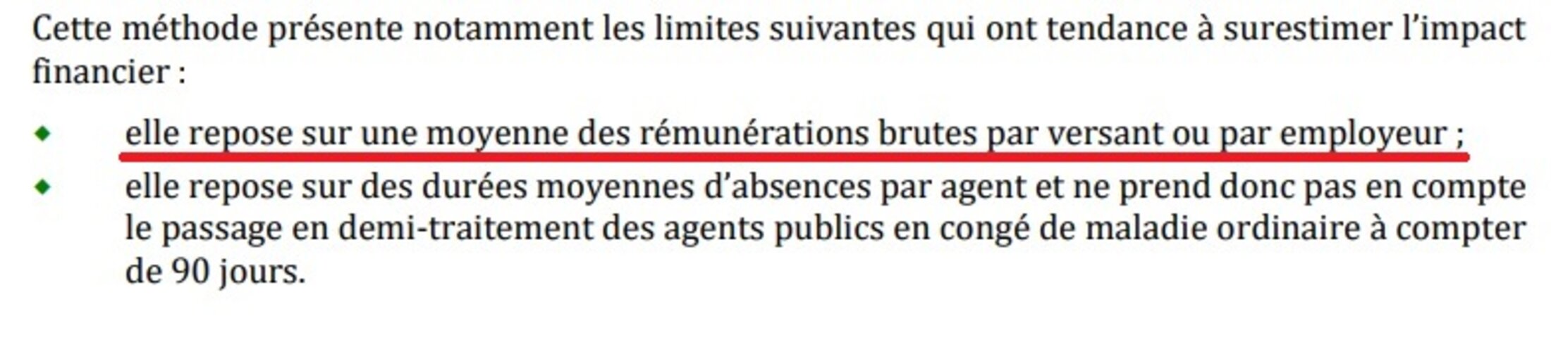 Il y a d’abord une chose assez lunaire, et qui amène d’emblée un certain flou : les auteurs vont comparer le passage de la FP à 2 ou 3 jours de carence avec le secteur privé, ok, mais sans tenir compte des 90 % d’indemnisations des jours qui suivent les 3 jours de carence du secteur privé. Cela n’est d’ailleurs pas explicité au premier abord, et les auteurs ne le préciseront même jamais …