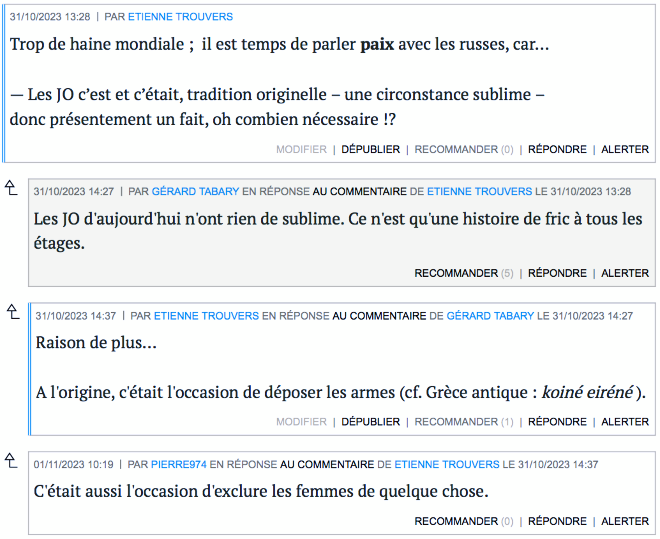 « Les guerres ne s’arrêtent pas pendant les Jeux » (Cf. Mediapart Guerre russe contre l’Ukraine : l’an II, reportage, 31 oct.2023 à 11h45). Or pourquoi ne pas saisir cette occasion-ci en vue des JO2024, refonder l'idée de l’esprit sportif ? Ce moment plus ou moins utopique d'un dépassement pour un autre plan de valeur !