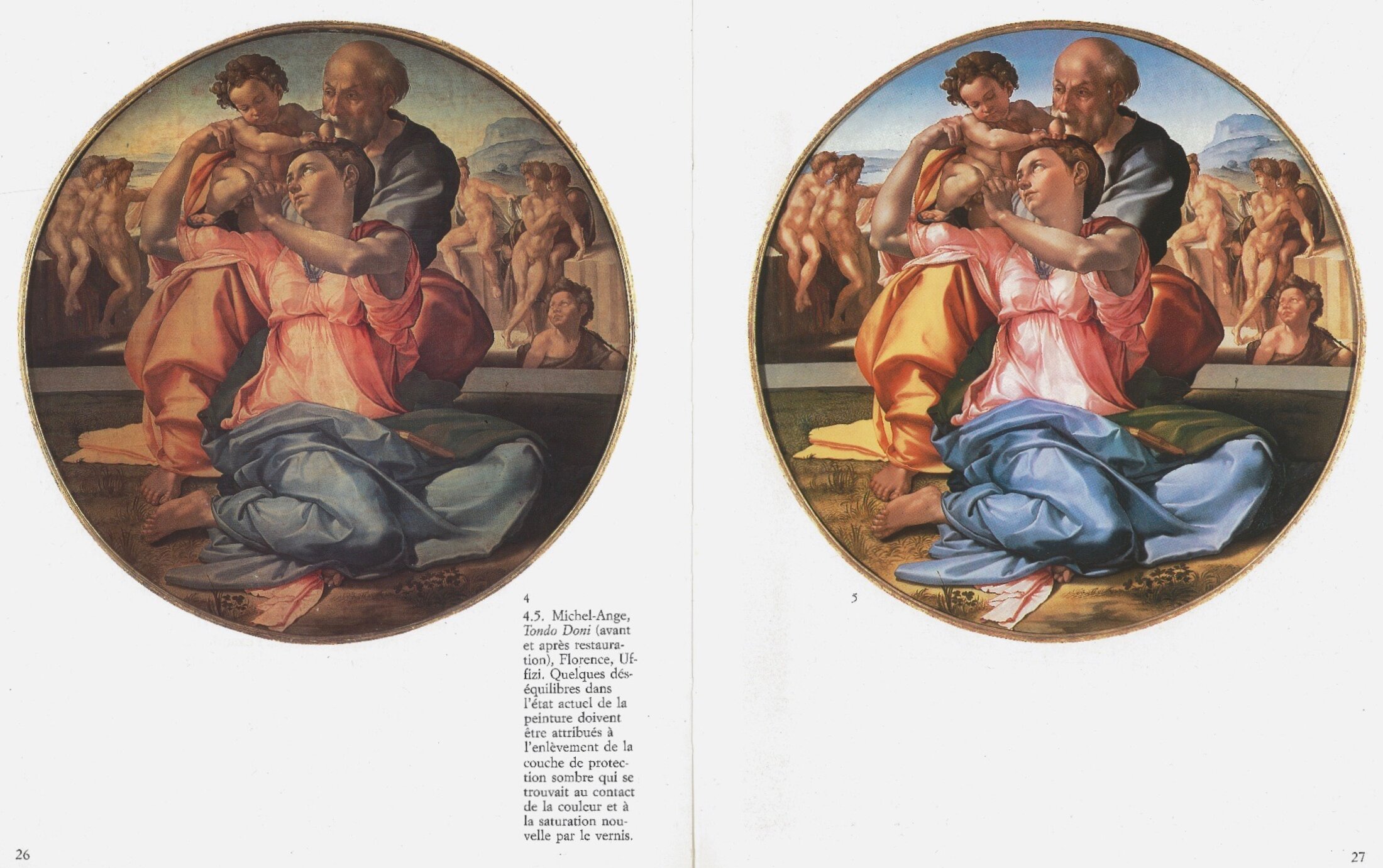 [4] – Alessandro Conti, 1987, Michel-Ange et la peinture à fresque - Technique et conservation de la voûte de la Sixtine, éd. La maison USHER. Ci-dessous, Tondo Doni (l’avant et l’après restauration, fig. 4 /5, p. 26-27) – Auparavant, ce tableau était un monde de saveurs fusionnelles et de nuances blondes, climat d’affection, de liens (mystère des glacis colorés en peinture) ; le tout est devenu d’effet métallique, cru, clinquant, dans un cercle dont l’espace paraît chaotique (comme troué par des coups de projecteurs).