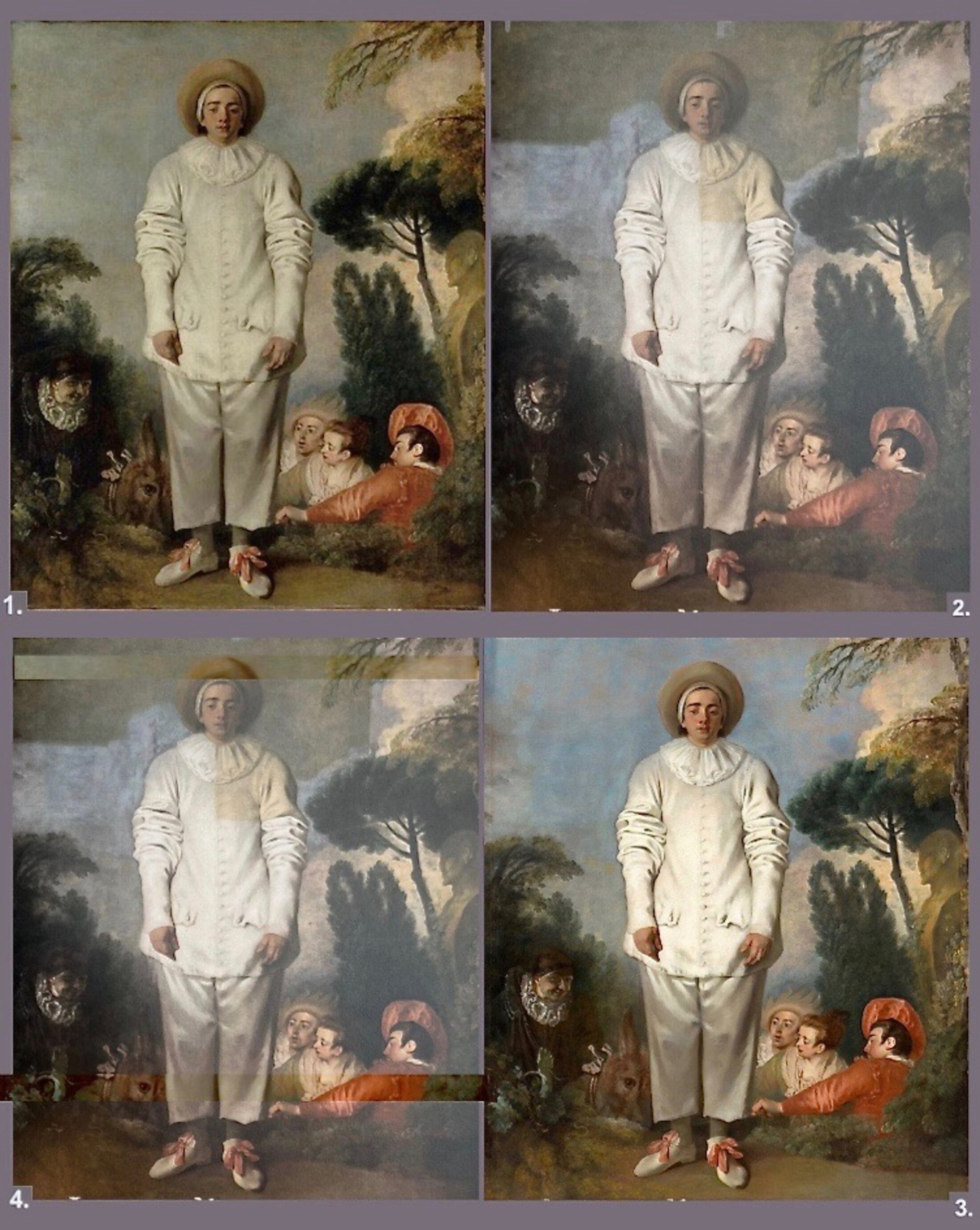 Voici trois états successifs du visage du Gilles. – Qu’y voit-on ? Pas à pas, chaque intervention de restauration-esthétique gomme un peu plus les demi-teintes originelles du tableau et en accentue les contrastes livides, contrariant ainsi les jeux significatifs de ce coloriste du XVIIIe. Dans ce détail central, l’expression pleine de mystère et de vie retenue a subi une mutation qualitative. Observons par exemple la diffusion du clair-obscur sur le front ; l’expression subtile du regard du Pierrot a été modifiée, adultérée, appauvrie.