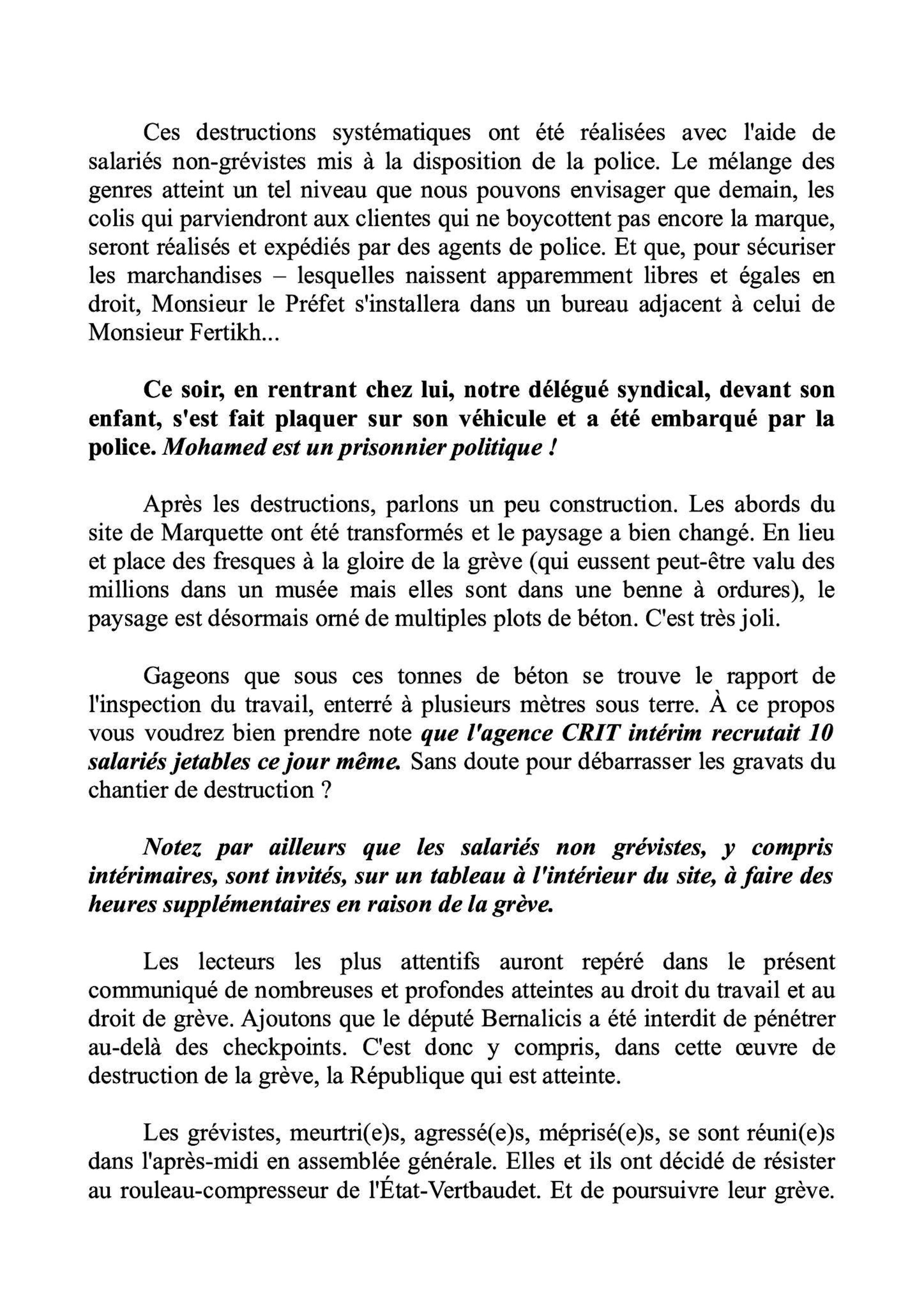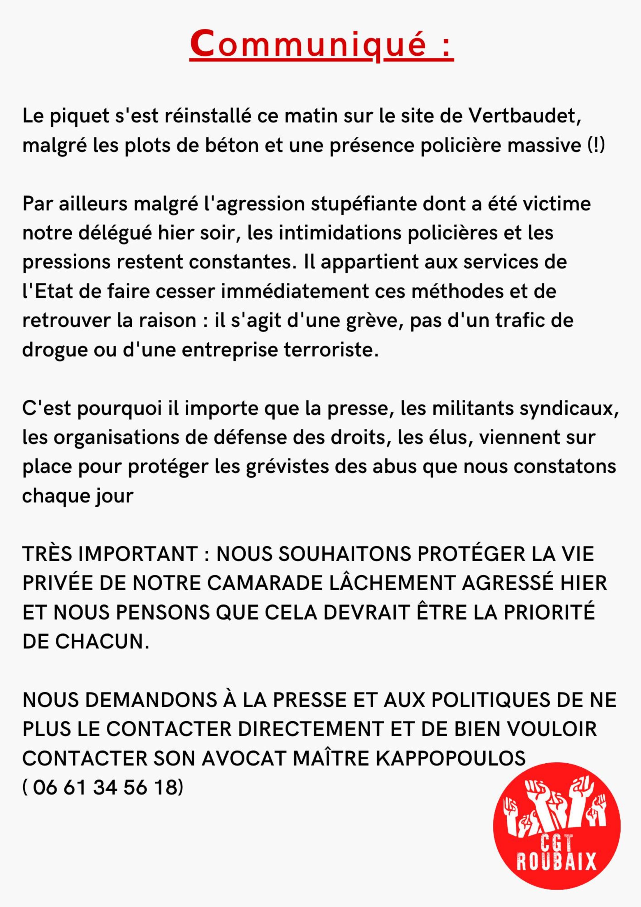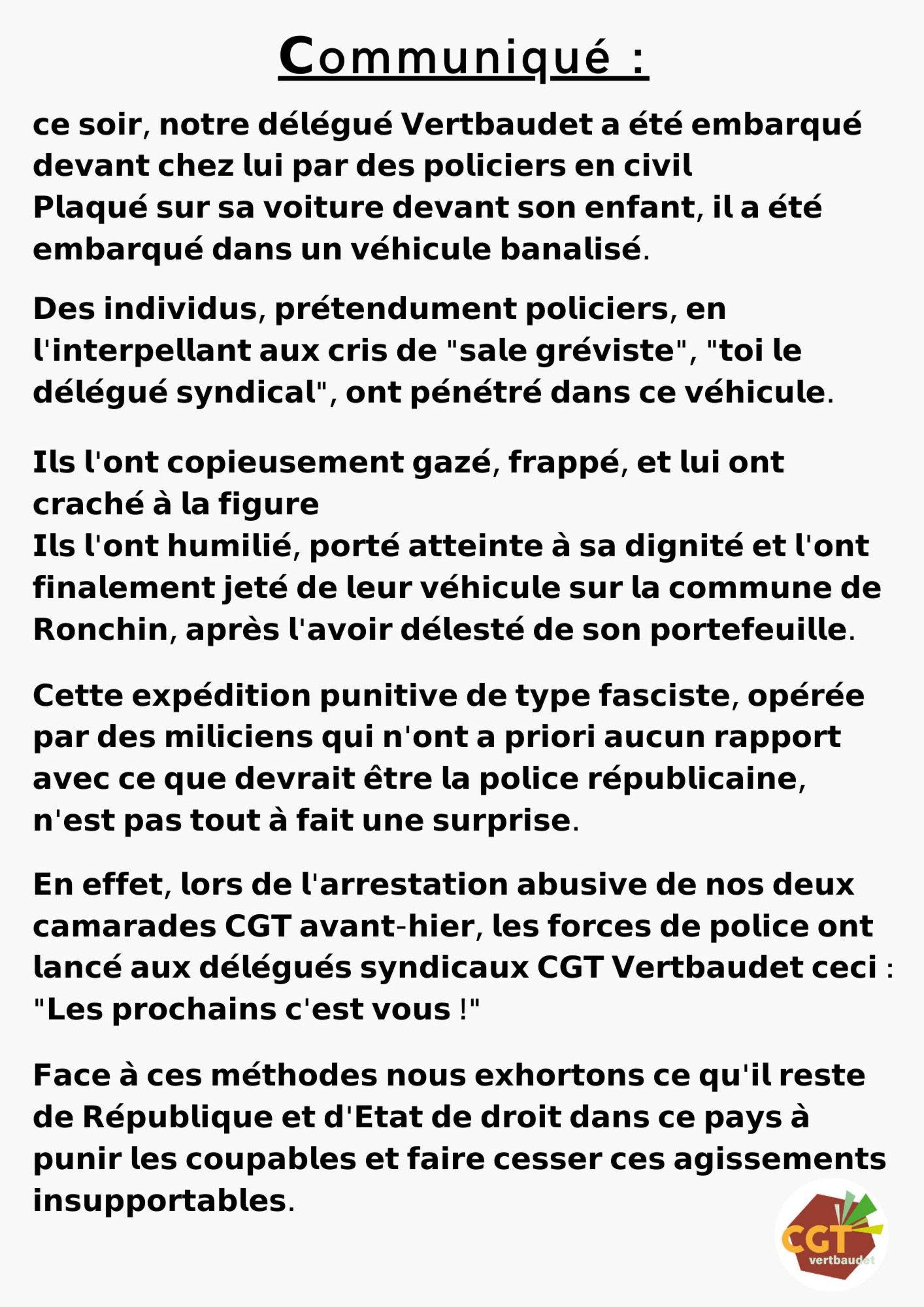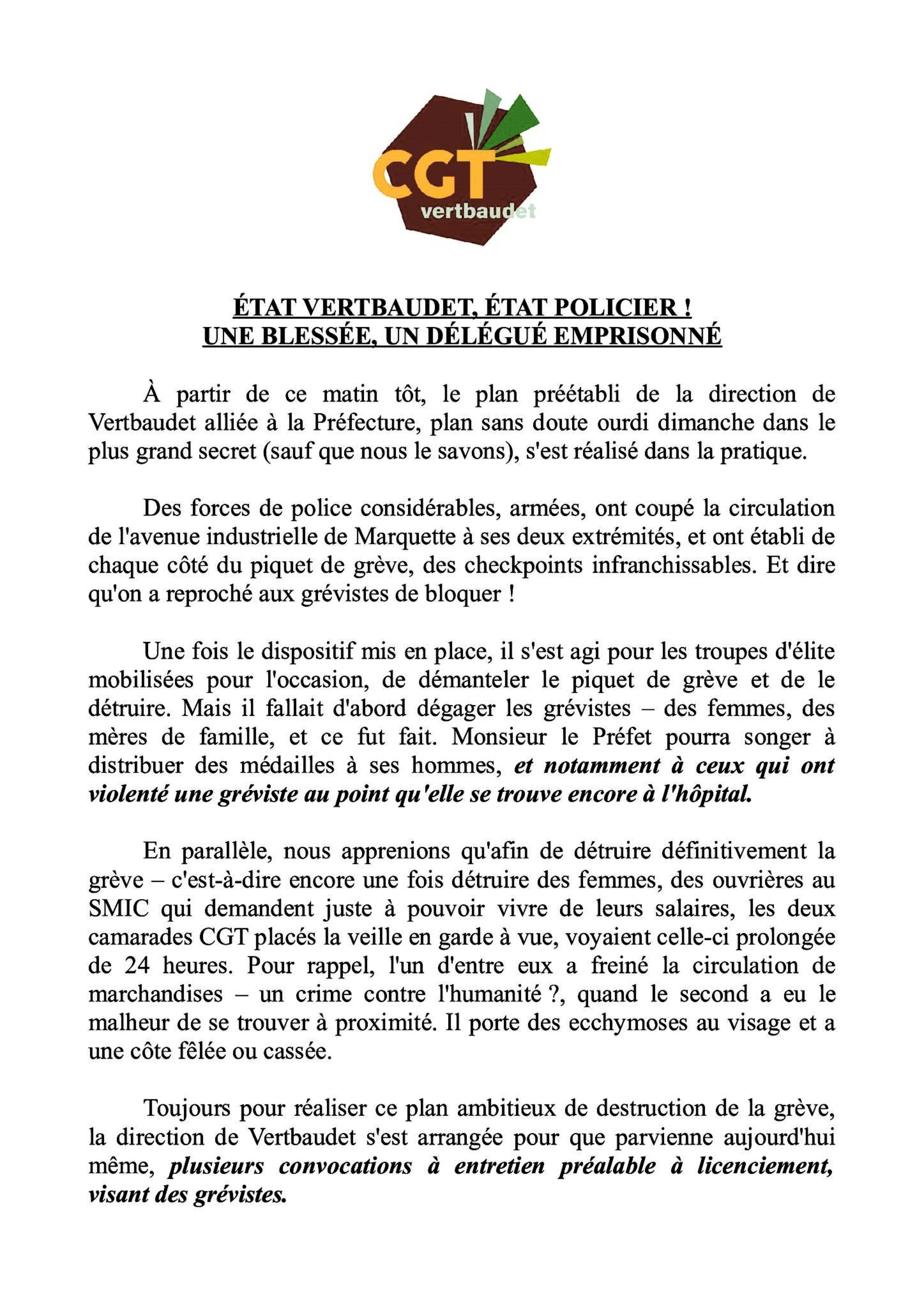 État Verbaudet État policier ! Une blessée, un délégué emprisonné