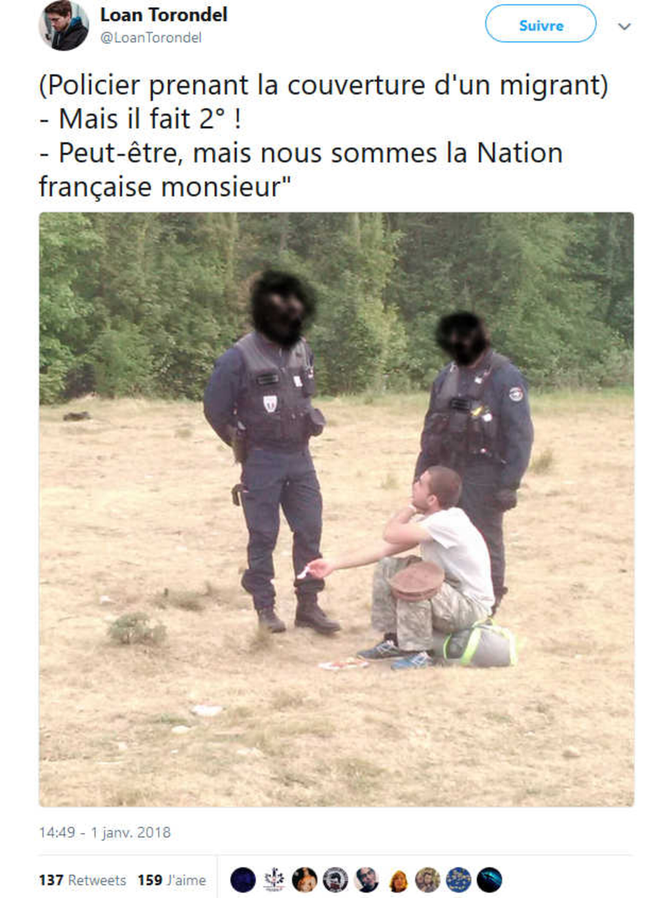 La photographie jointe au tweet montre des agents de police français se tenant au-dessus d’un homme qui semble être un migrant assis sur un sac de couchage. La légende suggère que les agents de police sont sur le point de prendre la couverture de cet homme, et ce, en plein hiver.