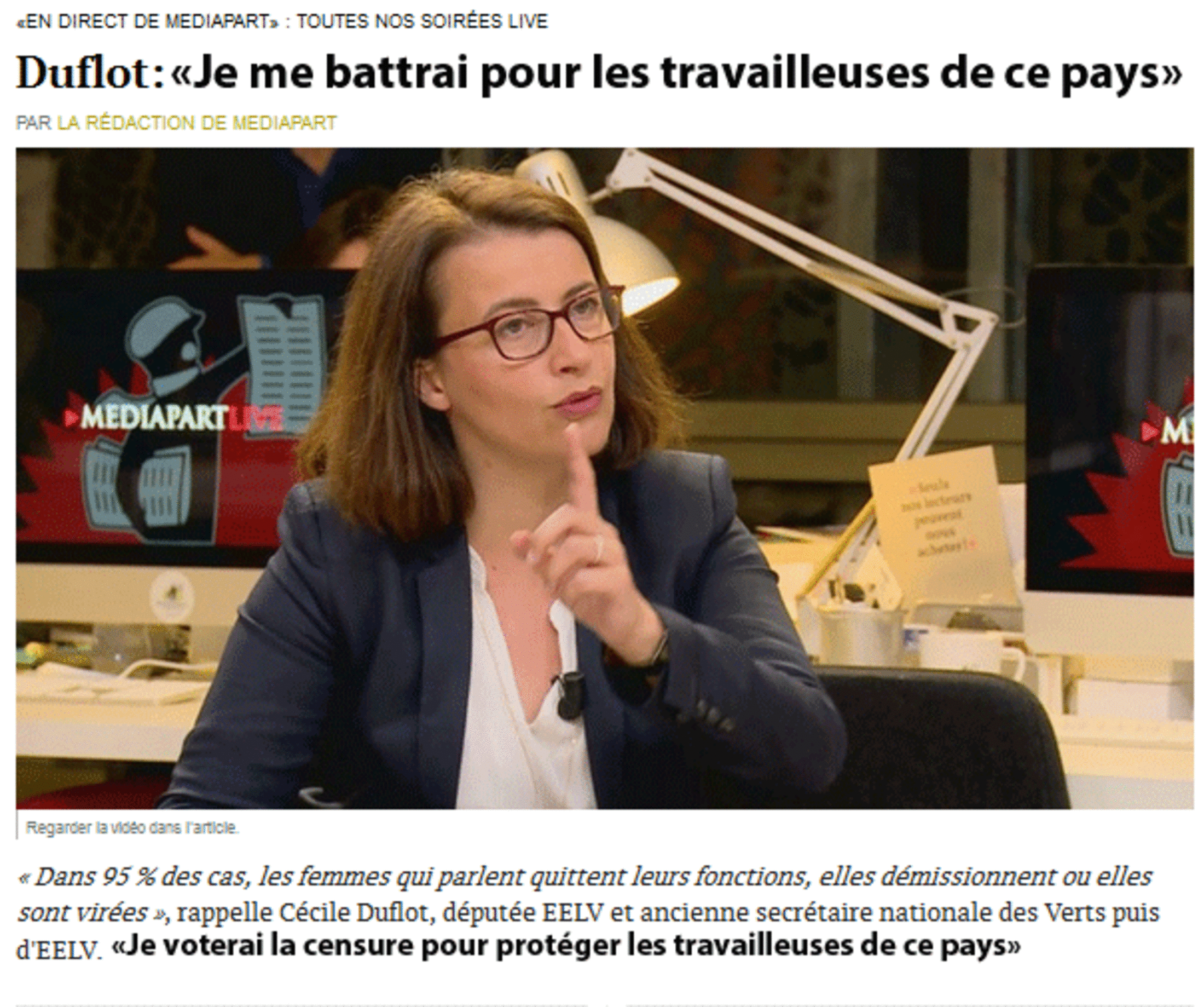 Le Parti EELV est le successeur structural des radicaux de la IVème République apportant des Députés complémentaires aux gouvernements de droite comme de gauche, élus d'ailleurs à la discrétion des partis dominants (puisque ne représentant rien dans les urnes). Mme Emmanuelle Cosse est ainsi entrée dans un gouvernement de droite extrême, celui de Valls et Macron, tandis que Mme Duflot ne participe qu'à des gouvernements plus à gauche. C'est le parti des opportunistes, dont les membres sont tout à leurs luttes de pouvoir entre-eux, véritable plaie. Et c'est grâce à ce parti notamment que la loi El-Khomri risque bien d'être adoptée, Mme Duflot se refusant à voter une motion de censure déposée par la droite, seul moyen institutionnel d'empêcher l'immolation des droits des travailleurs et plus encore des travailleuses. Le Musée de l'Europe & de l'Afrique appelle à mettre toute la pression populaire sur les Députés ayant signé une motion de censure de gauche mais refusant de voter la motion de censure de droite et donc de faire tomber un gouvernement honni.