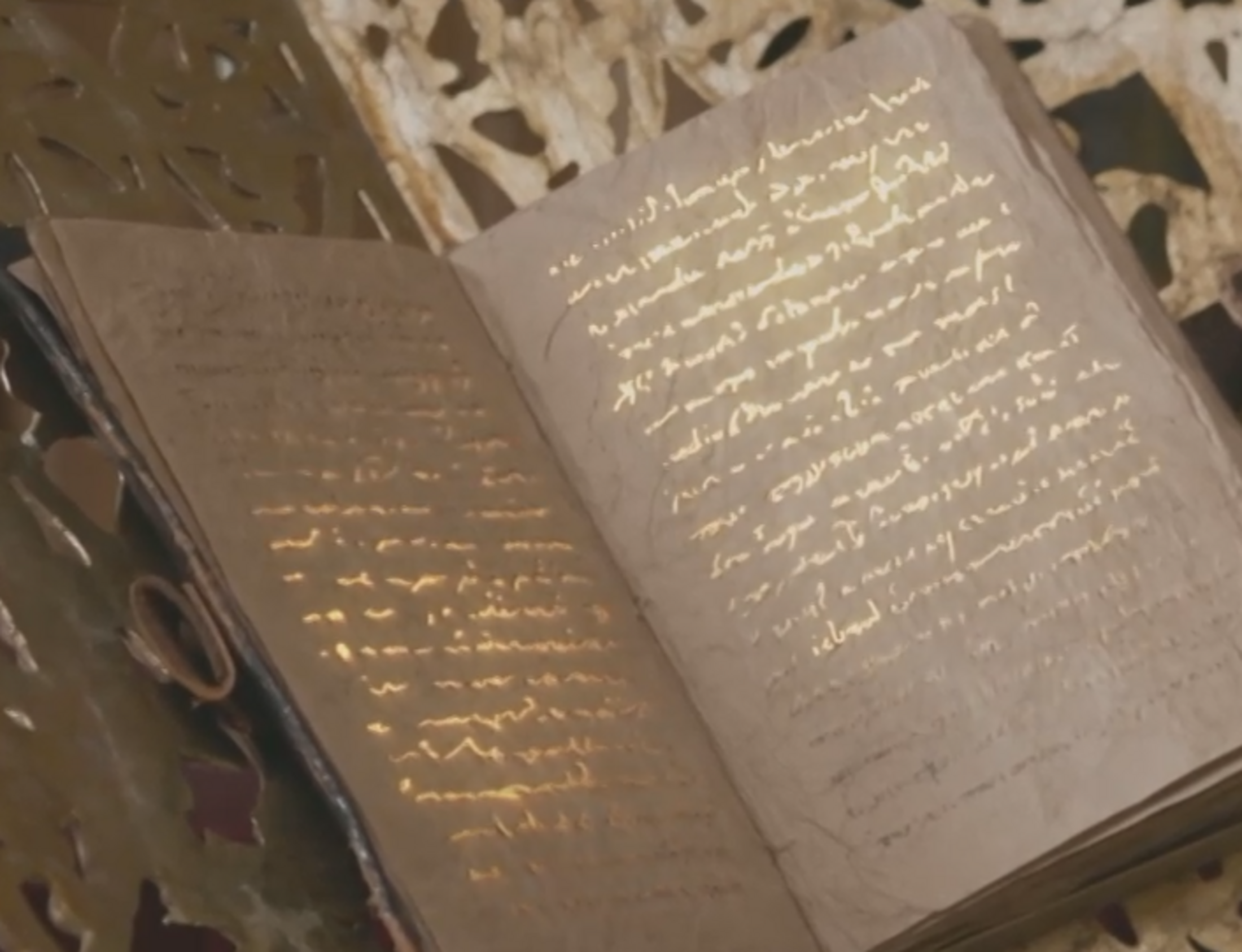 Rien à voir avec notre document. On pourra d’ailleurs remarquer au cours du téléfilm une certaine incohérence dans la forme d’écriture du manuscrit ; les premières images montrent des signes assez indistincts :