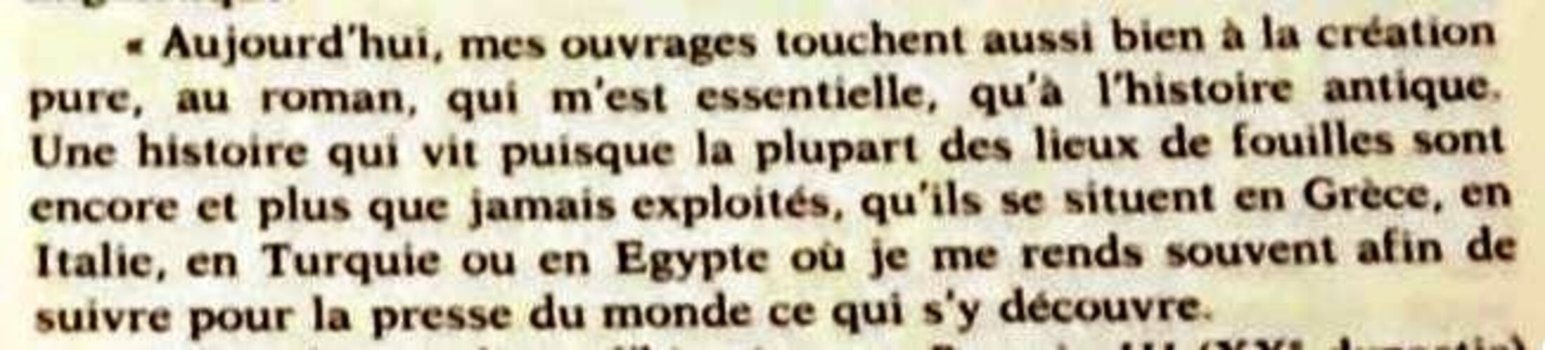 Elle se présentait donc comme une journaliste chargée de rendre compte du travail des archéologues. Elle ajoutait d’ailleurs : « mon dernier livre d’histoire sur Ramsès III (…) et mon dernier roman, Le secret du pharaon (…) sont en partie nés des récentes découvertes archéologiques. » Elle disait bien « des découvertes », et non pas, comme elle allait le faire plus tard, « de mes découvertes ».