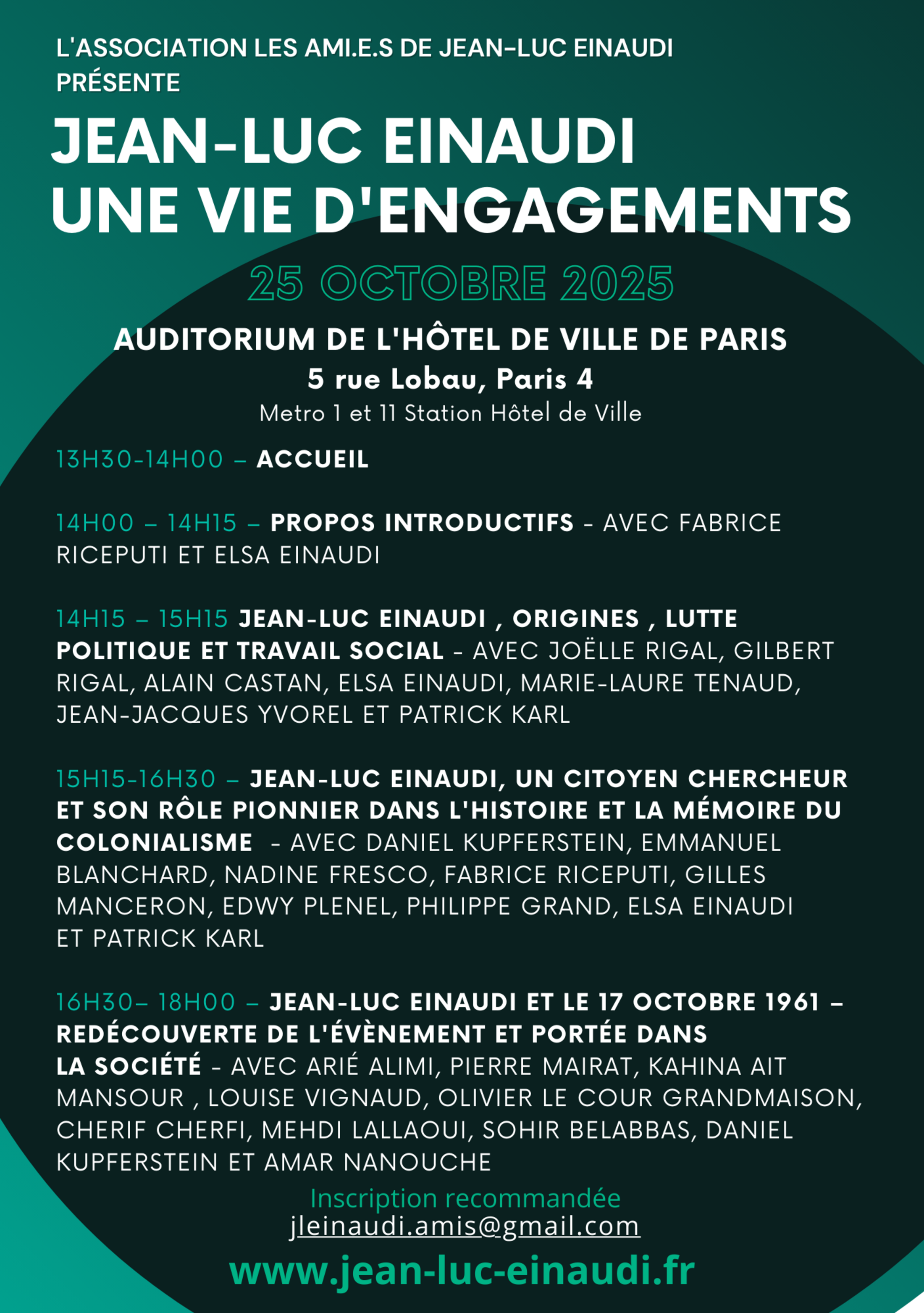 Le 25 octobre 2025, à l’Hôtel de Ville de Paris, l’Association des Ami.e.s de Jean-Luc Einaudi lui rendra hommage en revisitant les multiples engagements de celui que l’historien Mohammed Harbi qualifia lors de sa disparition en 2014 de « héros moral ».