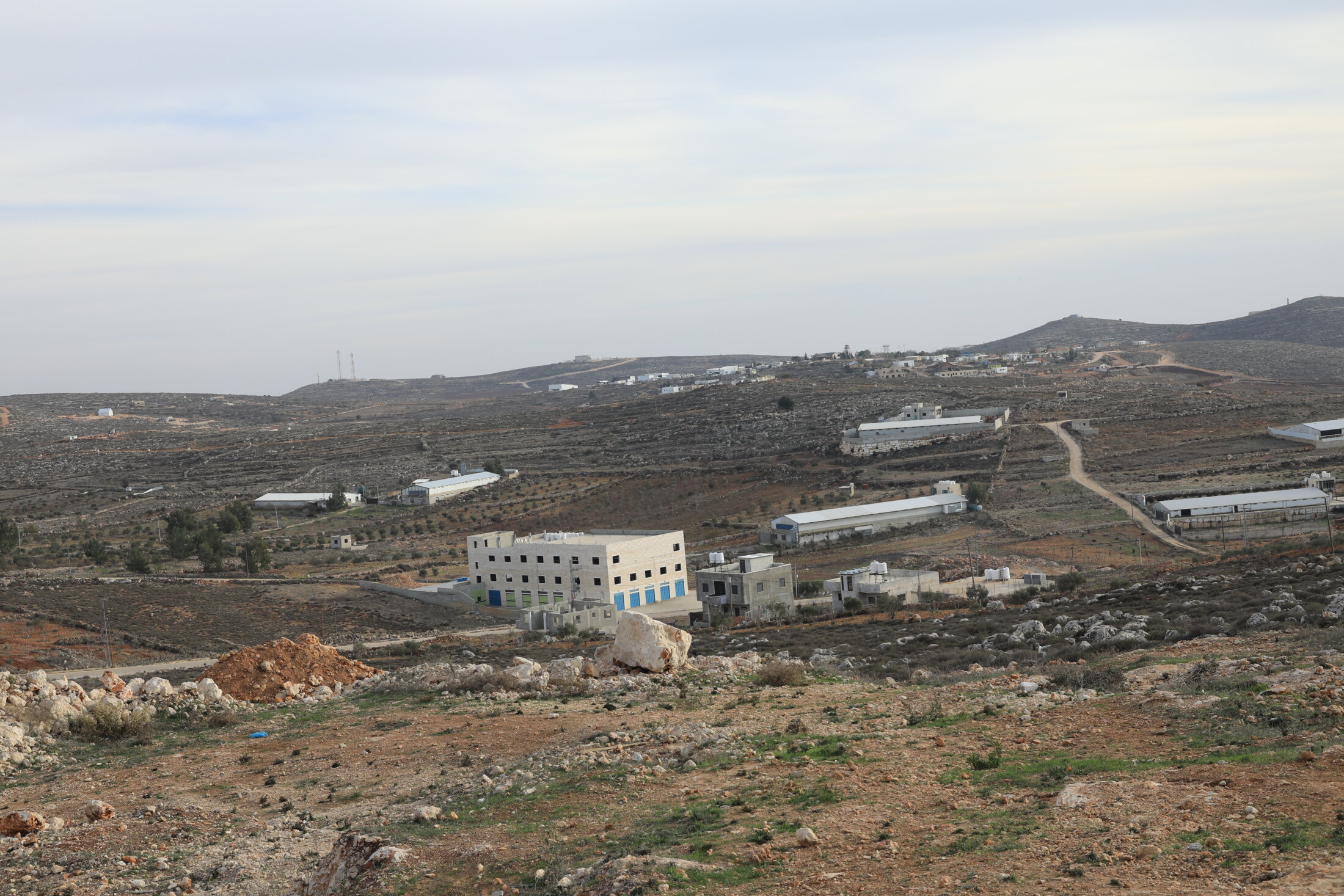 Sur le chemin vers une troisième étape dans Qusra, nous embarquons deux volontaires internationales, deux jeunes femmes. A présent, nous sommes dans la partie Sud du village, sur une partie un peu plus en hauteur. Face à nous, deux autres colonies. La première n’est constituée que de quelques mobil-homes épars sur le versant caillouteux d’une colline. Ces 200 hectares sont destinés à de futurs éleveurs Israéliens. En attendant, c’est quasiment vide, mais néanmoins interdit aux Palestiniens. Une autre colonie est installée sur la colline suivante. Entre le village de Qusra et cette colonie, à quelques centaines de mètres, nous observons des poulaillers, six ou sept bâtiments, chacun pouvant contenir entre 5000 et 10000 poulets. Ces élevages modernes faisaient la fierté des villageois. Mais après octobre 2023, les Israéliens ont coupés l’électricité et ont interdit l’accès à ces bâtiments. Les poulets étaient juste bien engraissés, prêts à être vendus. Nous demandons si les colons ont volés les poulets. Un des paysan nous réponds « Non, ils les ont juste laissés mourir, enfermés, sans eau ni nourriture ».