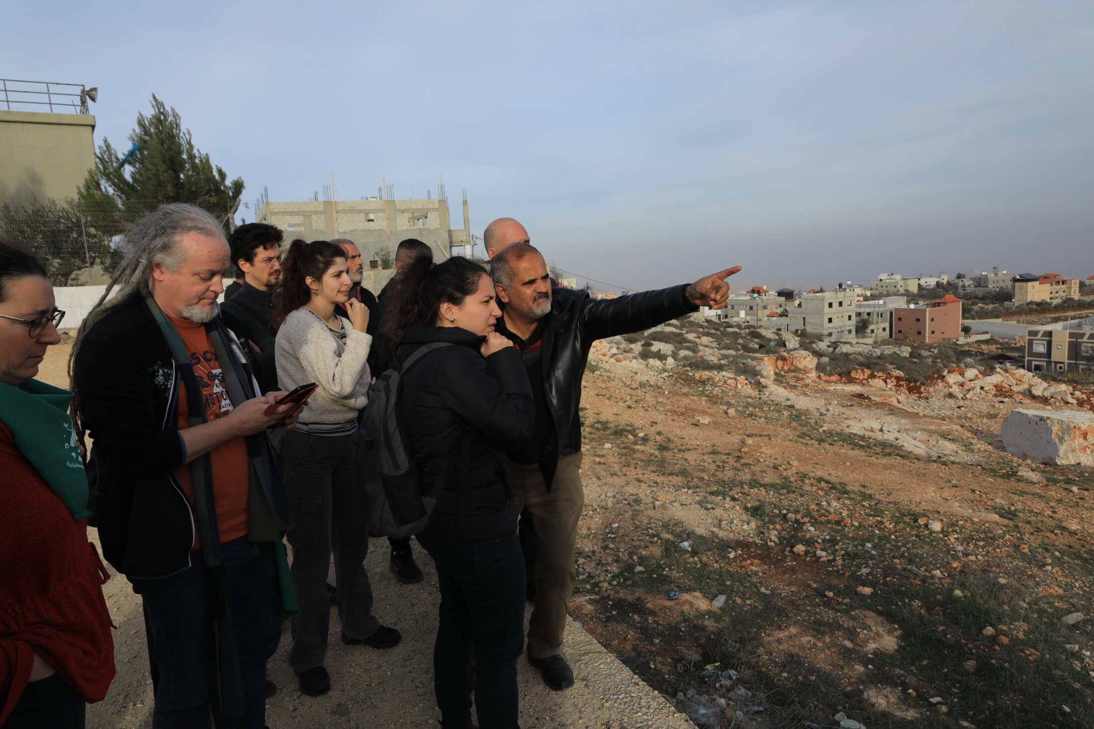 Direction l’Ouest du village à présent, de l’autre côté de cette même colonie. Nous nous arrêtons face à une barrière rouge qui bloque le passage vers la route principale. Cette barrière est fermée depuis le 7 octobre 2023, mesure de punition collective. La voie, récemment rénovée, monte tout droit vers la colonie, dont l’accès est contrôlé par un check-point et un mirador. Les voitures israéliennes passent en trombe en rasant les maisons palestiniennes. Autour, les colons ont pris les terres et planté de la vigne « pour l’export vers l’Europe » nous dit le maire. Il nous explique les multiples difficultés créées par ce barrage, en particulier pour les paysans qui ne peuvent plus passer en tracteur, mais aussi pour le petit commerce. Soudain, un pick-up militaire déboule. Deux soldats lourdement armés sortent et crient « Les étrangers doivent dégager ». Le maire s’approche d’eux pour tenter de parlementer. Nous reculons. Les enfants palestiniens se pressent autour de nous. Aghsan traduit. « Pourquoi vous ne restez pas ? Faites ouvrir la barrière ! ». Il se joue à cet instant quelque chose entre la volonté de dignité et la limitation du risque. Les Palestiniens ne veulent pas battre en retraite. Après tout, ils sont dans leur village, ils sont même de leur côté de la barrière. Fuad nous dit « Attendez, ne bougez pas ». Le ton monte. Trente secondes. Fuad nous dit de monter dans le bus. Nous partons. Nous avons honte de notre impuissance.