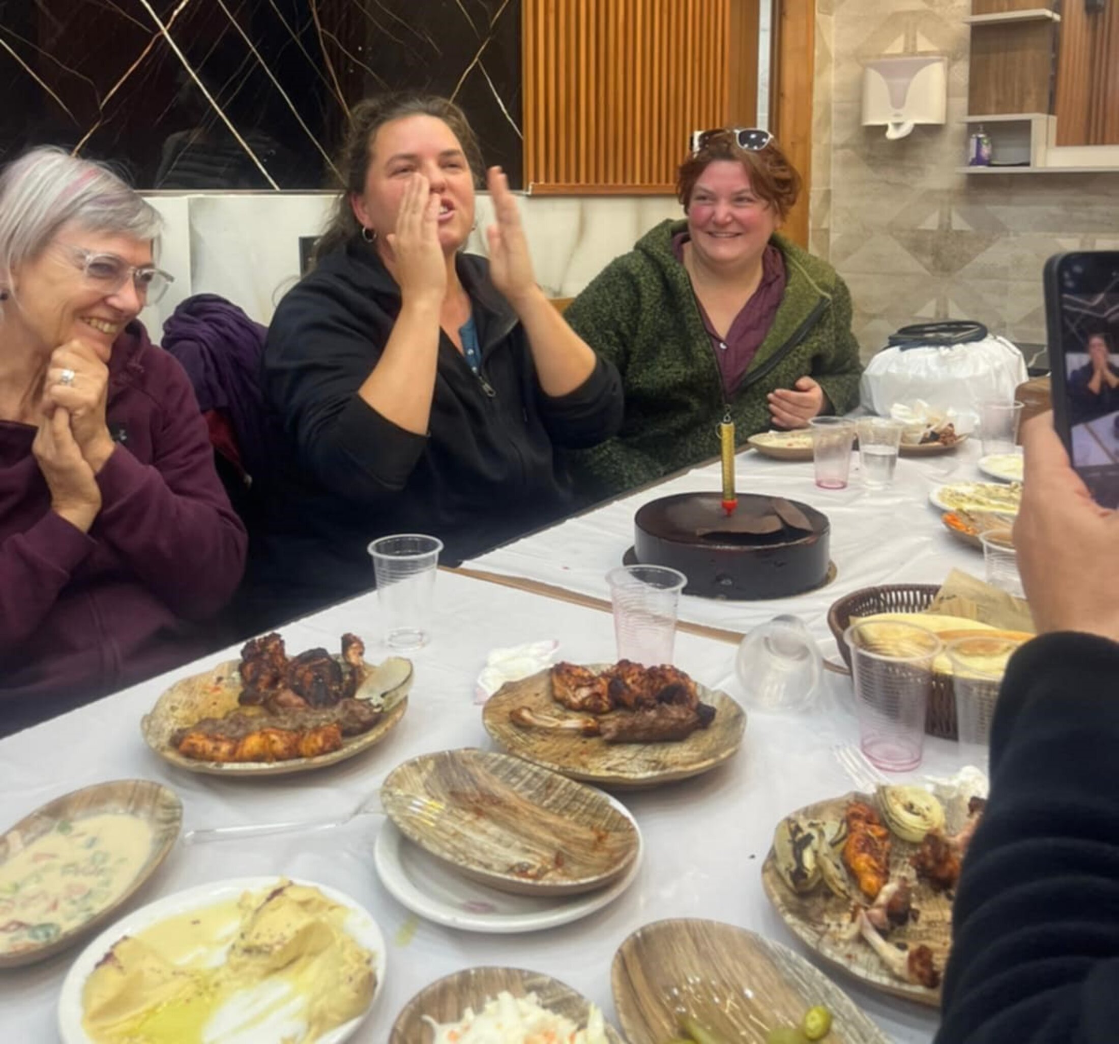 Je remarque que Aghsan et Tamam se sont éclipsées et on les voit revenir 5 minutes plus tard avec un gâteau au chocolat et une grosse bougie au dessus. On me chante joyeux anniversaire en anglais et en arabe et j’ai les larmes aux yeux, forcément ! Quel cadeau précieux que de fêter mes 43 ans ici, entourée de personnes exceptionnelles, sur cette terre de résistance.