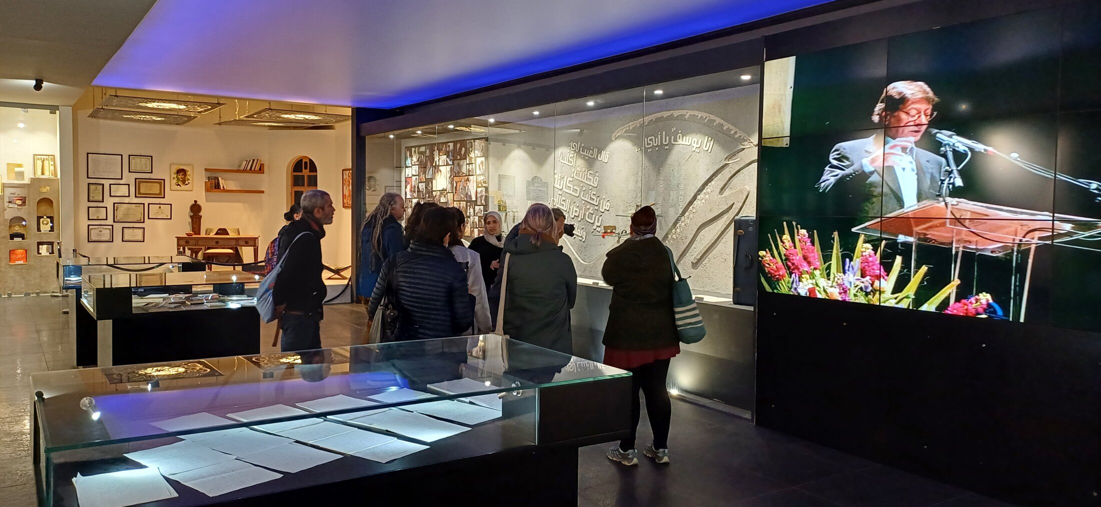 Notre groupe se rend ensuite au musée dédié à Mahmoud Darwish, le grand poète palestinien, qui a sa tombe juste à côté de la Mouqata’a, le corps de bâtiment destiné à l’autorité palestinienne. Il me semble significatif que le « grand homme » de cette nation soit un poète, un homme de lettres qui a su poser les mots justes sur les souffrances humaines, des douleurs à la fois universelles et ancrées dans l’expérience spécifique de l’exil et de la perte propre aux Palestiniens.