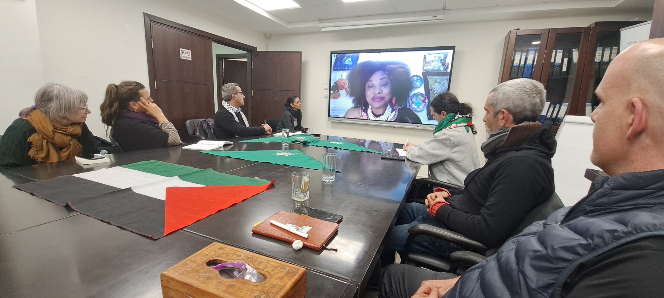 Nous retournons ensuite aux bureaux de l’UAWC où l’équipe doit participer en ligne à la remise du prix de l’Alliance américaine pour la Souveraineté Alimentaire, dont la région « Pays arabe et Afrique du Nord » de la Via Campesina est la gagnante pour 2024. Un prix est aussi attribué à une organisation basée aux États-Unis, et cette année il est attribué à une association qui développe l’agriculture urbaine dans des quartiers populaires à Chicago. La jeune femme noire américaine qui prend la parole ne peut pas cacher son émotion face à la situation en Palestine et à Gaza. Dans le chat de la conférence en ligne, les participants se présentent en mentionnant qu’ils viennent des « territoires non-cédés de ... », façon de reconnaître la violence de l’histoire coloniale américaine et les droits des peuples autochtones. La cérémonie de remise des prix se conclut avec une musique traditionnelle amérindienne. Après la fin de la conférence en ligne, notre délégation et les amis palestiniens échangeons sur cette étrange cérémonie. On n’a pas pu s’empêcher de pouffer de rires à certains moments tant les efforts pour copier les traditions amérindiennes nous ont semblé maladroits, et à la fois, nous avons l’impression que cela traduit une volonté réelle d’une partie de la population américaine de ne plus passer sous silence son passé de violence et d’extermination et d’essayer de construire d’autres types de relations avec les autres peuples. Nous aussi en Europe nous avons du boulot pour nous démêler de notre histoire de dominants et construire le chemin de l’internationalisme.