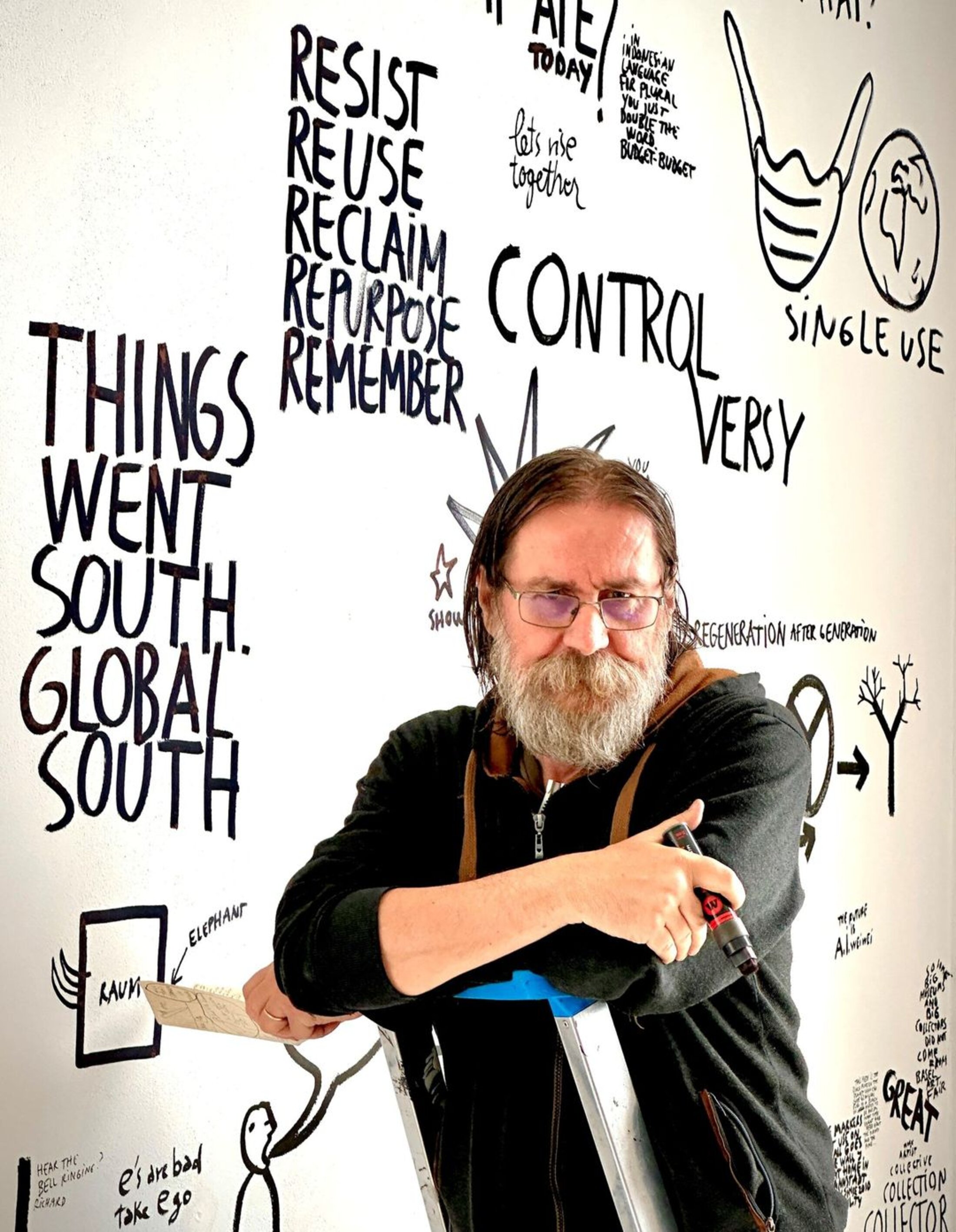 Dan Perjovschi : J’ai étudié dans une académie des Beaux-Arts, en essayant de faire de grandes œuvres [rire], mais avec la chute du communisme dans mon pays, j'ai intégré l’équipe éditoriale d’un hebdomadaire de Bucarest qui s’appelle Revista 22, en référence au 22 décembre 1989, une date importante de la Révolution roumaine qui correspond au renversement de Ceaușescu. Mes dessins ont évolué vers un style plus direct, plus axé sur des sujets de la réalité roumaine, en phase avec la vocation politique du magazine. D’une certaine manière, mon travail sur la scène artistique et mon travail journalistique ont fusionné, si bien que dans les années 2000, j’ai commencé à dessiner directement sur l’architecture.