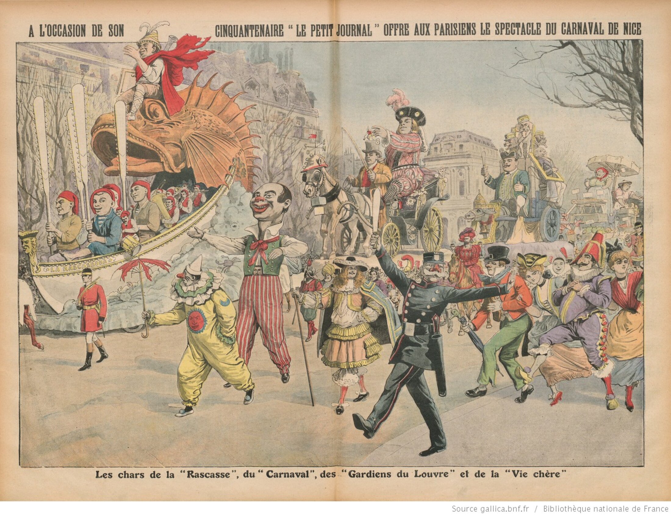 Le Petit Journal atteint un tirage d’un million d’exemplaires et pour fêter son cinquantenaire, il va faire monter à Paris cinq chars du Carnaval de Nice à ses frais. Mais avec les chars il fait venir à la capitale les animateurs et danseurs de Carnaval, qui pour certains d’entre-eux, visitent Paris pour la première fois. Les parisiens n’avaient jamais vu un tel corso.