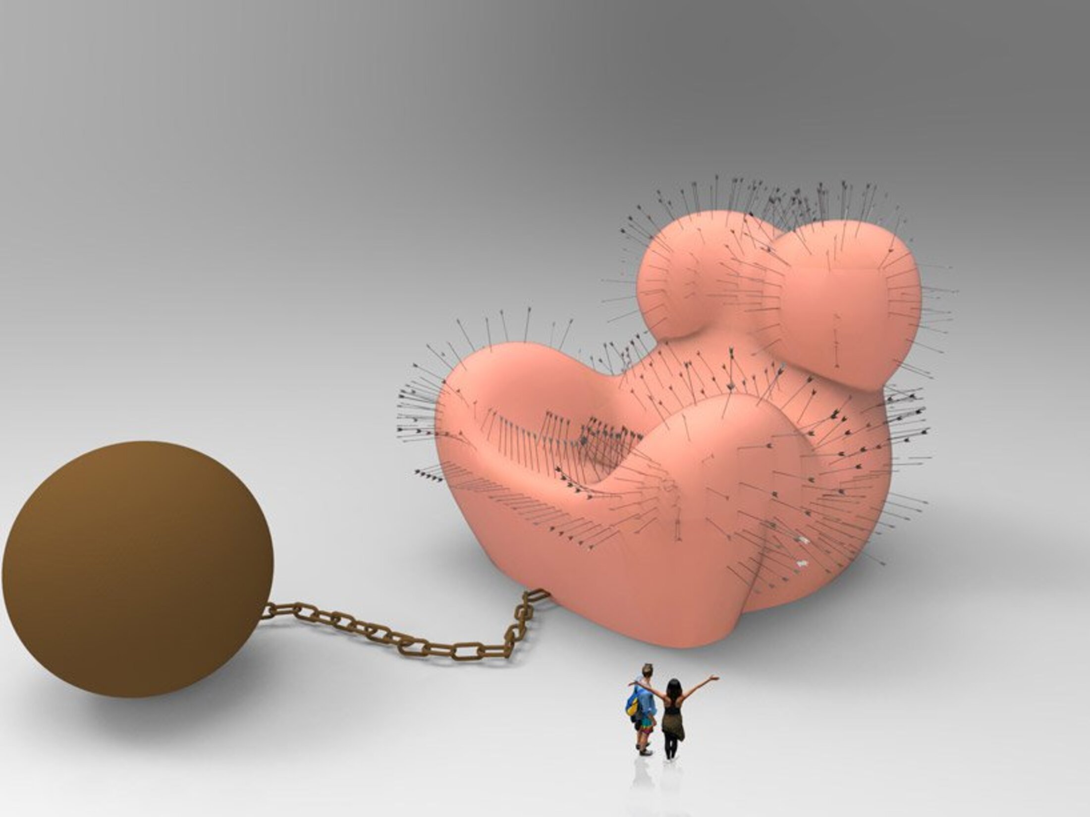 L’objectif avec  ce fauteuil percé d’innombrables flèches de huit mètres de haut, veut souligner la violence faite aux femmes. La sphère enchainée qui l’accompagne est un repose-pied qui incarne l’image d’une femme prisonnière. Cette majesté souffrante va rester sur la place jusqu’au 4 avril.