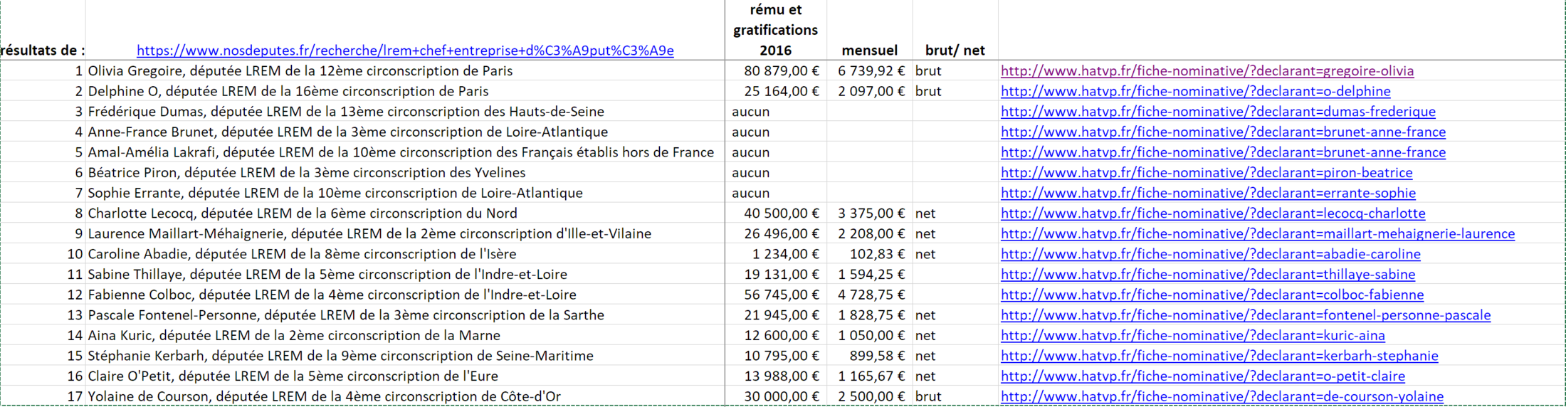 Après avoir pris le temps de se familiariser avec le site et échangé avec ses admin sur quelques bizarreries de référencement, on fait une recherche par mots clés avec les mots "députée chef entreprise LREM", 17 noms apparaissent. On se rend ensuite sur le site internet de la haute autorité pour la transparence de la vie publique et on va chercher les revenus déclarés par les députées en question, qu'on mensualise et dont on précise si c'est du brut ou du net.