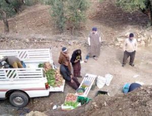 Pour le travail dans les champs, les femmes partent travailler 2 par 2, les unes le matin, les autres l’après-midi. |Une bonne partie des hommes est partie à Casablanca, Marrakech ou Agadir pour travailler] Ils s’occupent de l’approvisionnement car le souk hebdomadaire a été fermé. Un commerçant en fruits et légumes monte une fois par semaine au village. Une personne par maison vient acheter légumes et fruits.Les jeunes ont demandé à ceux du village qui sont partis travailler à Agadir ou à Casablanca de ne pas revenir au village de peur qu’ils ramènent avec eux le virus. »