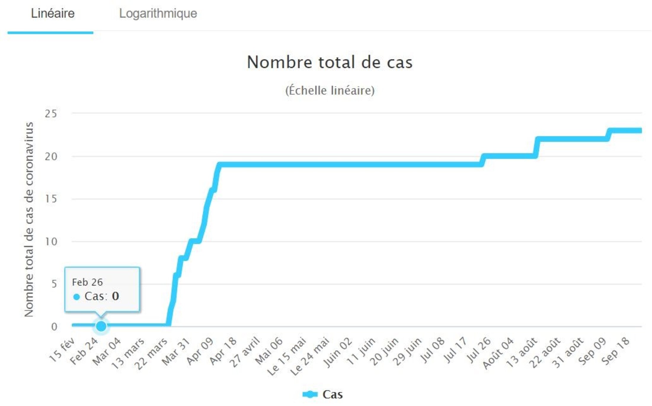 Au 24 septembre 2020 : Cas confirmés : 23 ; Cas suspects[1] : 318 ; Guéris : 22 ; Décès : 0