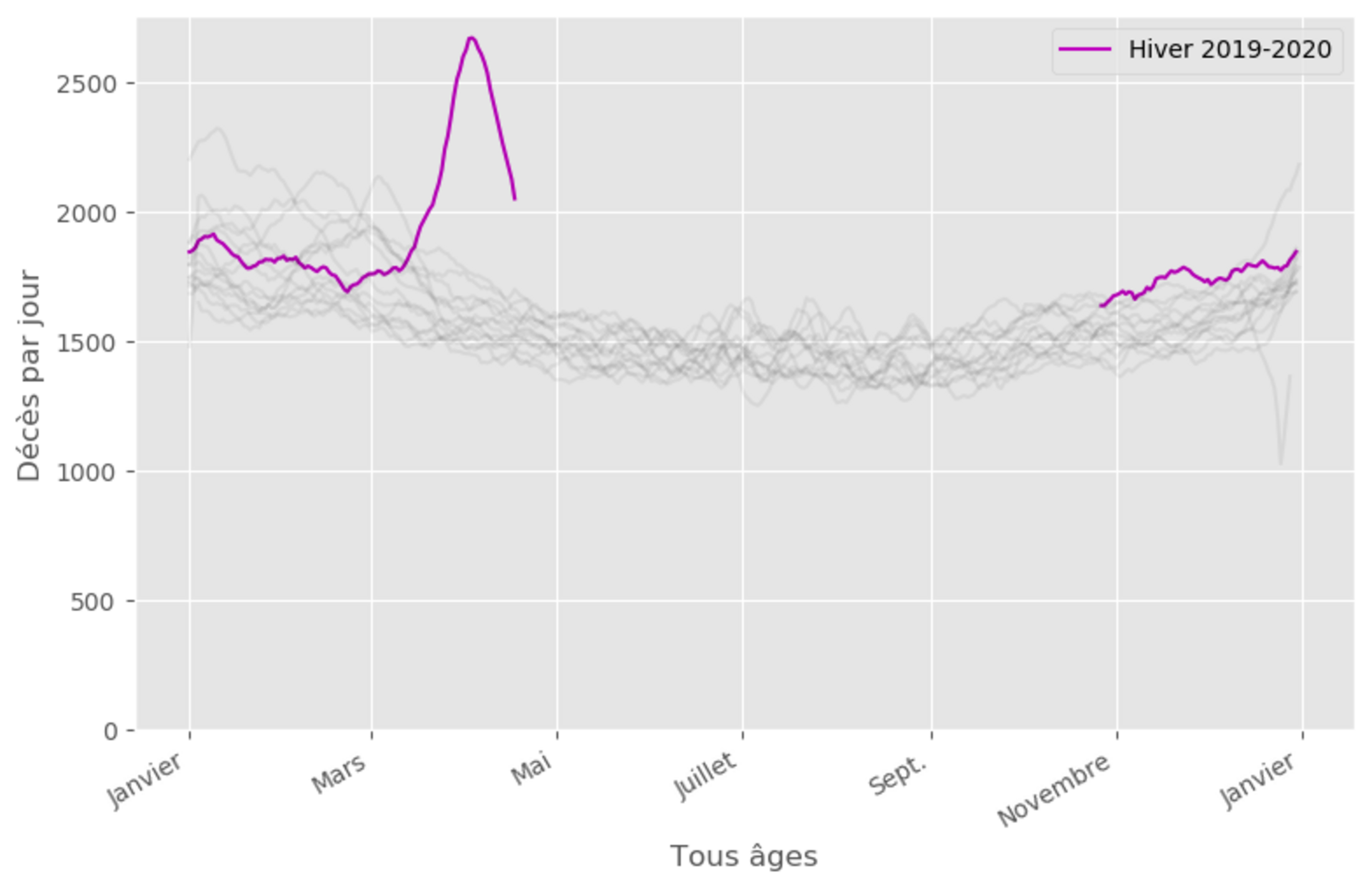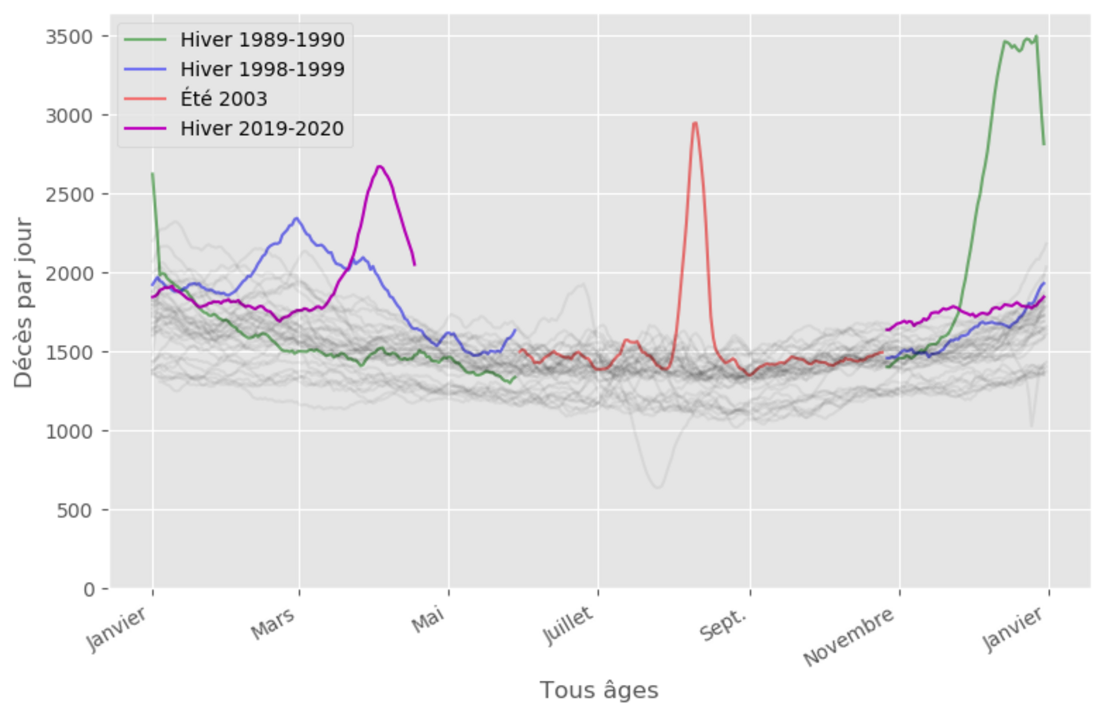 - Le pic en vert correspond à une épidémie de grippe en hiver 1989-1990. La surmortalité peut être estimée à au moins 65 000 morts.